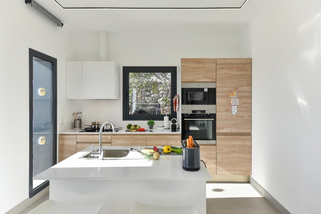 The open-plan living area seamlessly combines lounge, dining, and kitchen spaces. The lounge offers plush seating, a flat-screen TV, and direct access to the terrace, creating a perfect setting for relaxation or entertaining. The fully equipped kitchen includes an oven, dishwasher, washing machine, and dryer, providing all the conveniences needed for a comfortable stay.