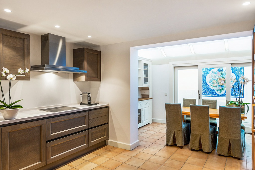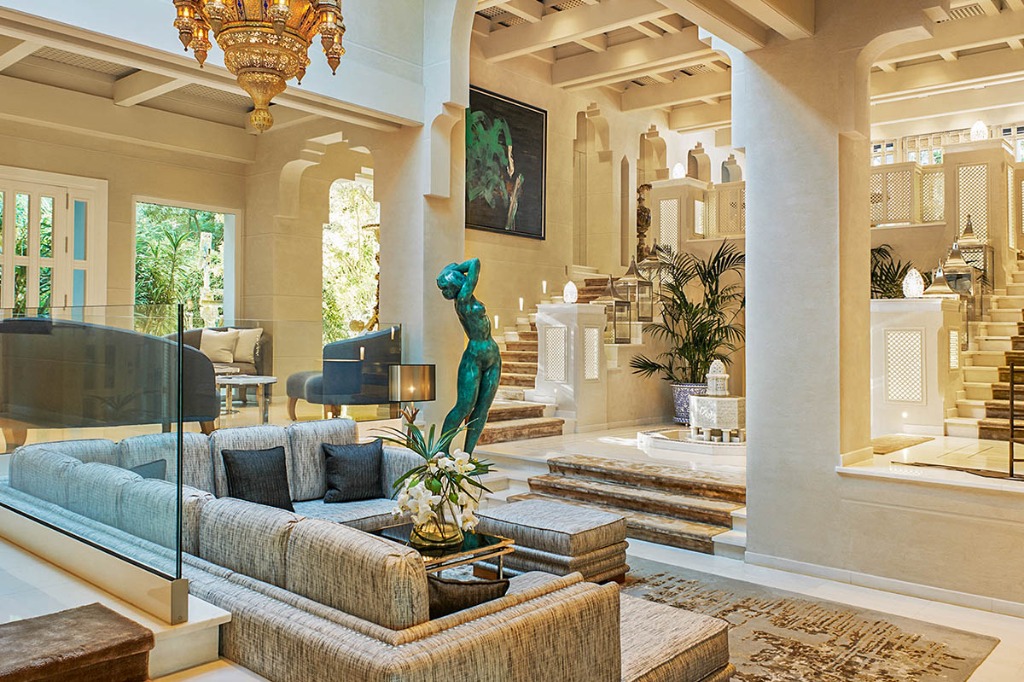 The villa's exterior exudes timeless elegance, with brick terraces, traditional blue-and-white tiles, and tranquil water features, while inside, neutral tones, chrome and mirror finishes, silk carpets, sculptures, paintings, and wood-burning fireplaces blend modernity with classic luxury. Grand spaces such as the entry hall and formal dining room feature Moorish-inspired motifs, while intimate areas like the breakfast nook or lounge offer cozy relaxation.