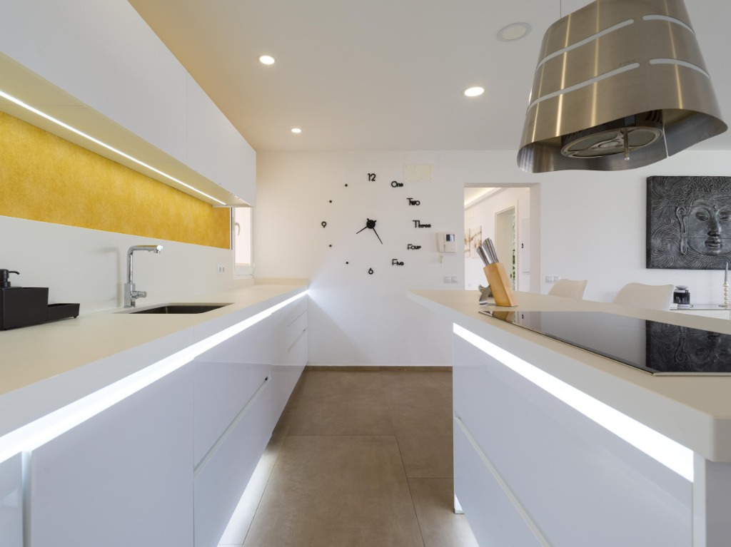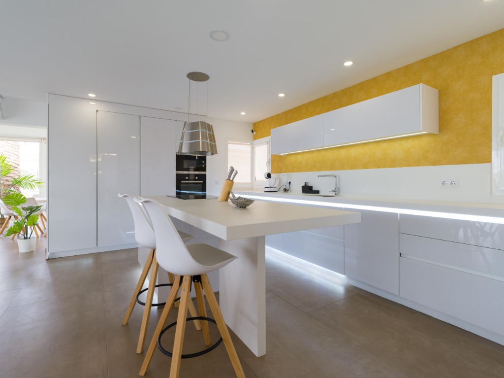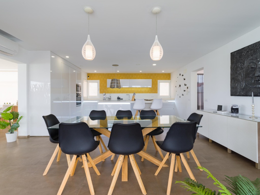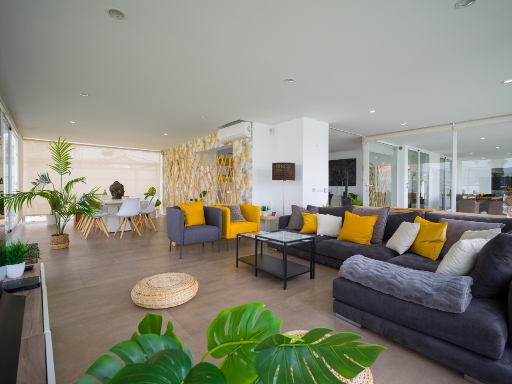 Inside, the villa welcomes guests with bright, open spaces and a carefully curated modern design. Natural light flows through every room, highlighting the clean lines, neutral tones and spacious layout that define the interior. The open-plan living room is furnished with comfortable sofas and stylish decor, creating the perfect setting for unwinding after a day of exploring the coastline or enjoying the island's lively atmosphere. The designer kitchen is fully equipped with all essential appliances, making home-cooked meals easy and convenient for longer stays.