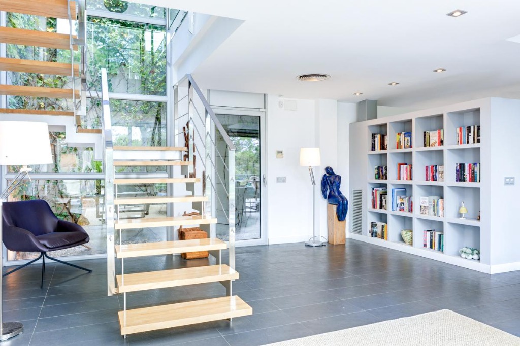 The villa is arranged over two floors, designed to maximize natural light through large floor-to-ceiling windows. The open-plan living and dining area features comfortable sofas, armchairs, a bookcase, and a TV, creating a welcoming space for relaxation or socializing. The stylish kitchen includes modern appliances, a glass splashback, and a breakfast table, perfect for casual meals or family dining.