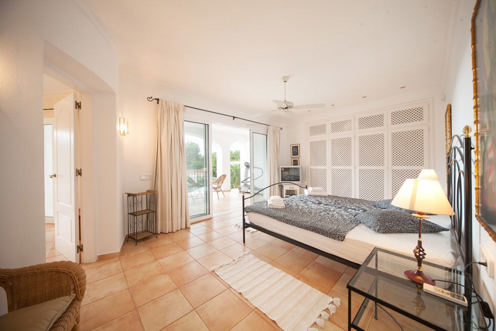 First Floor - Master double bedroom with ceiling fan, television, en-suite bathroom, and access to covered terrace