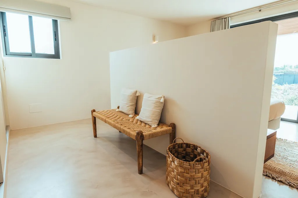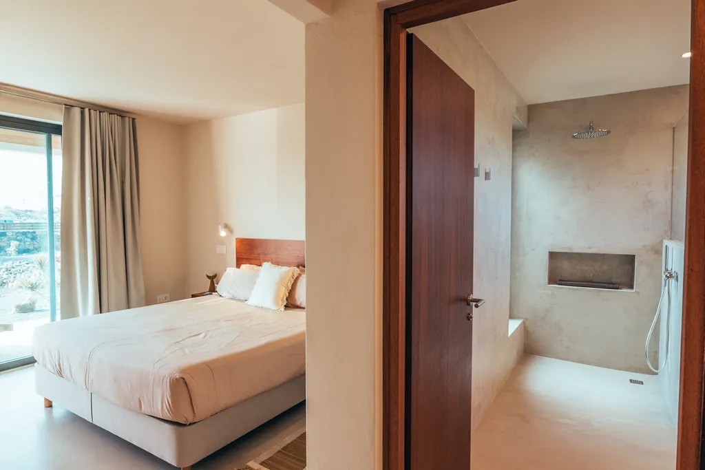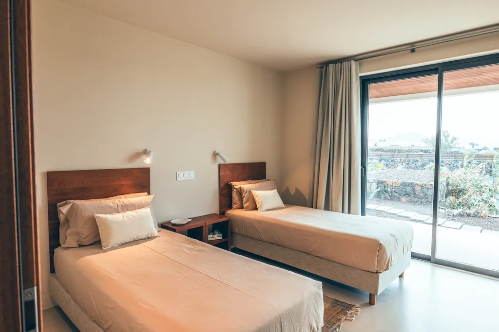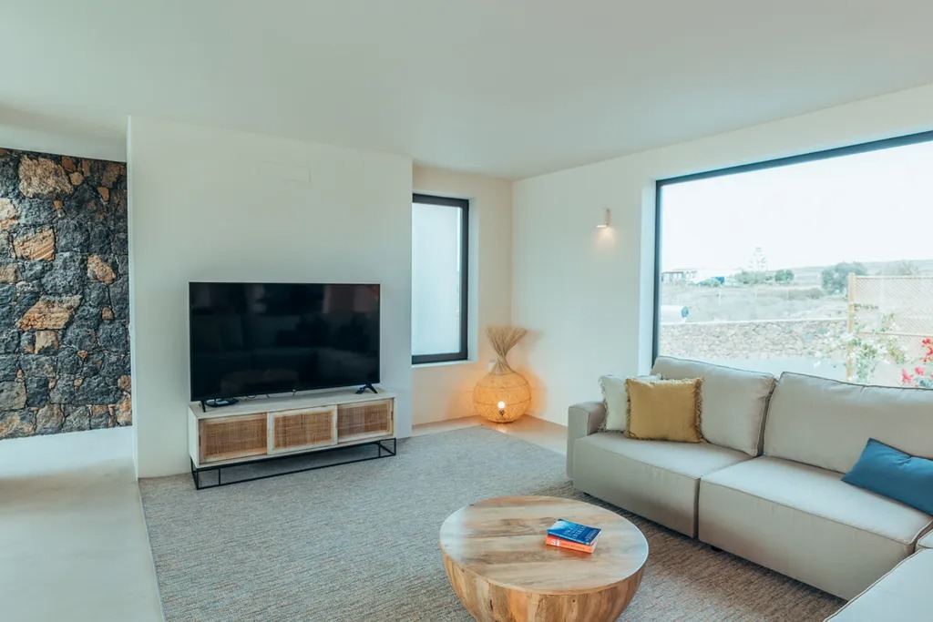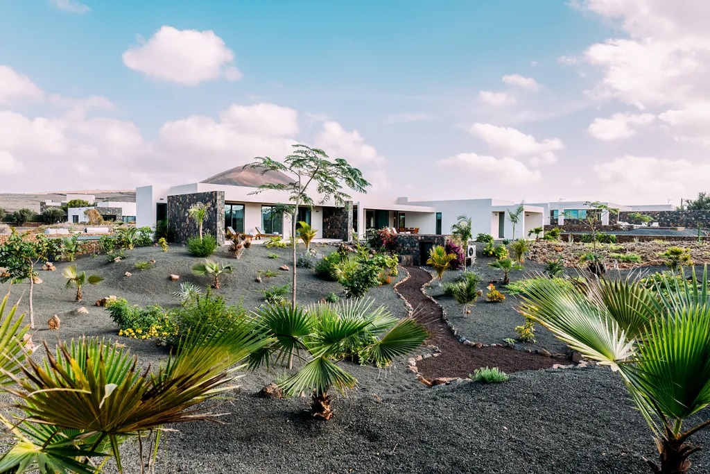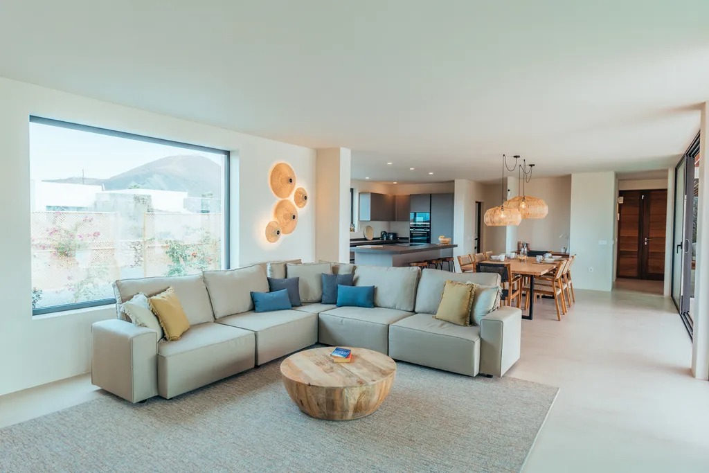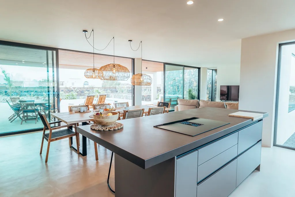 Inside, floor-to-ceiling windows provide seamless views of the volcanic garden and allow natural light to fill the living spaces. The communal areas include a TV lounge with panoramic views, a dining room connected to the kitchen, and a chef's kitchen equipped with high-end appliances and a social island. The interiors are meticulously designed to blend elegance with functionality.