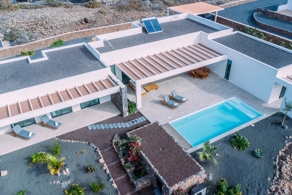 Exterior features: - Outdoor dining area for eight guests - Chill-out area with hammocks - Comfortable sun loungers - Heated outdoor pool - Volcanic garden landscaping - Terraces for relaxation and sunbathing