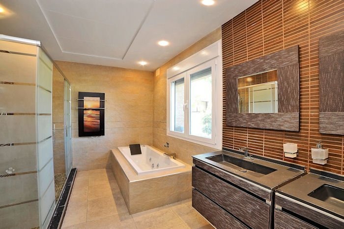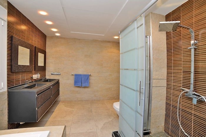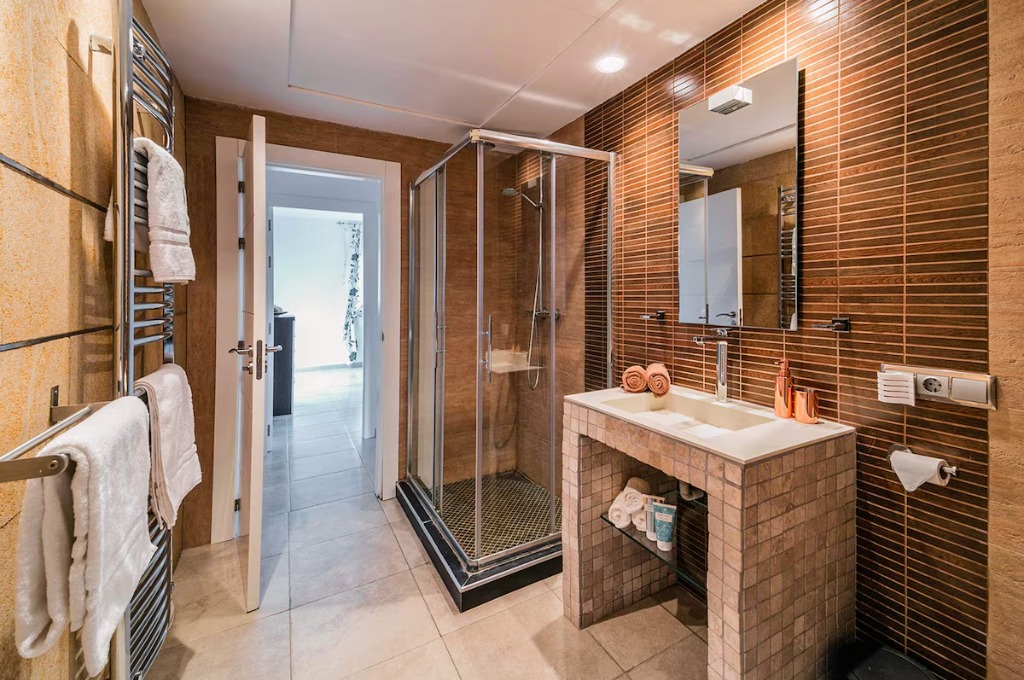 Each of the five bedrooms is designed for rest and comfort, with air conditioning and high-quality furnishings. Three bedrooms feature double beds, one includes twin beds, and another offers a versatile layout, making it ideal for both adults and children. The four bathrooms are modern, bright, and equipped with walk-in showers and elegant fittings.