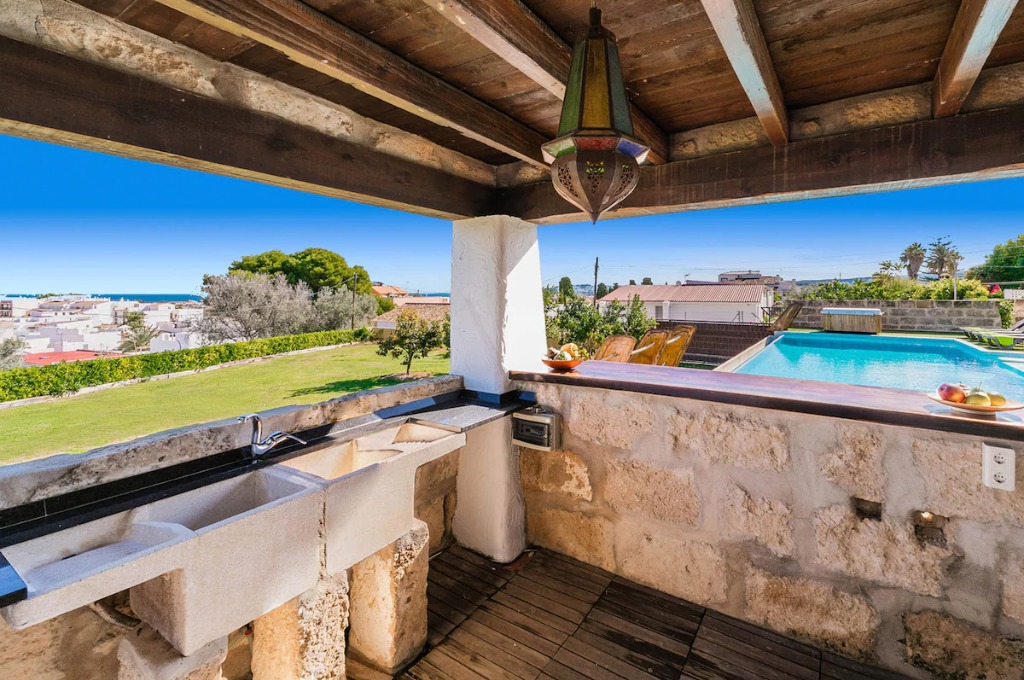 Inside, the villa is bright, spacious, and tastefully decorated in a contemporary Mediterranean style. The open-plan lounge and dining area provide comfortable seating, WiFi, and air conditioning throughout. Large sliding doors allow the interior and exterior spaces to flow effortlessly together, creating a perfect environment for indoor-outdoor living. The fully equipped kitchen includes all modern appliances, making it easy to prepare meals for family and friends.