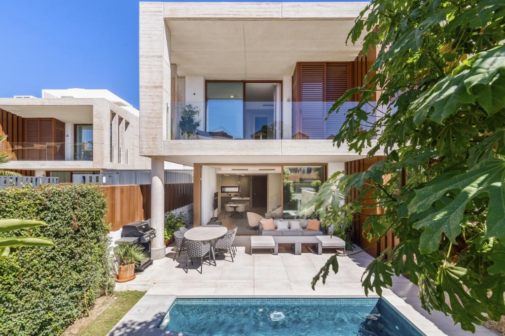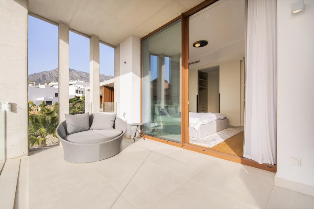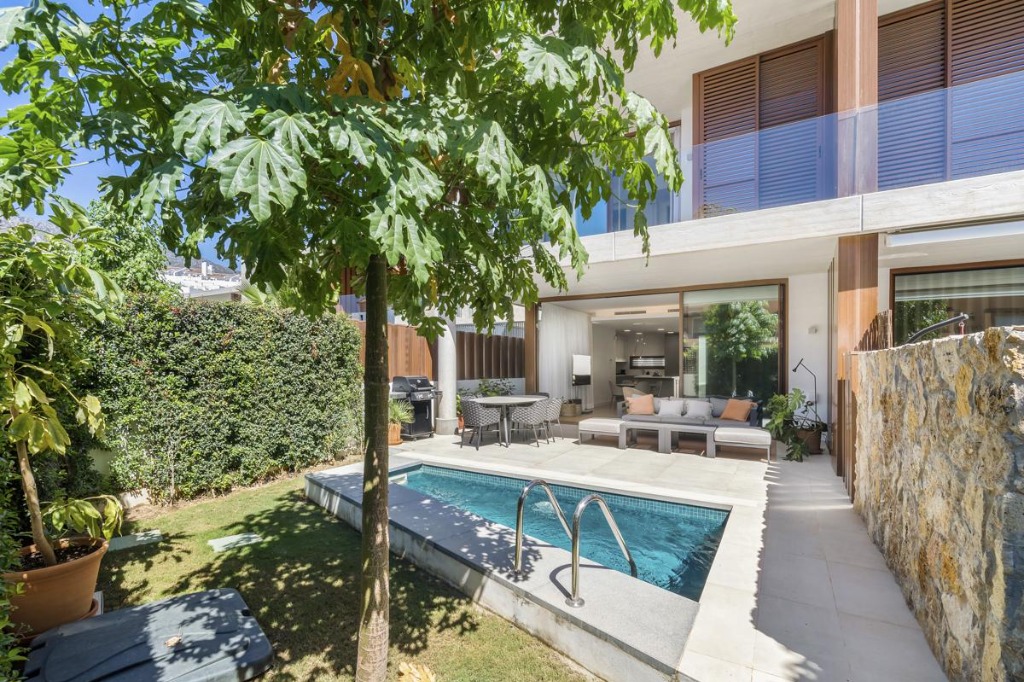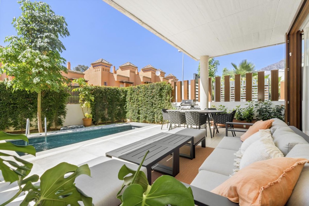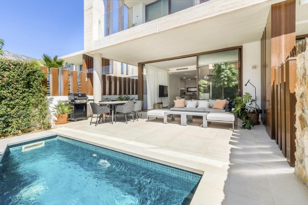 The exterior of the villa features a private plunge pool surrounded by a manicured garden and a terrace equipped with a large sofa, dining area, and state-of-the-art barbecue. This outdoor space provides the ideal setting for sunbathing, alfresco meals, or simply relaxing in the Spanish sun.