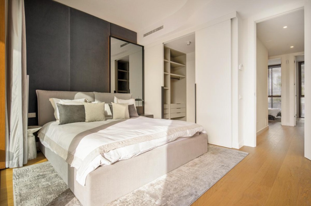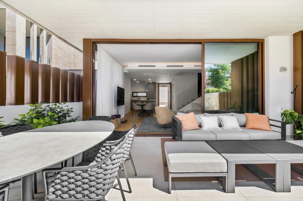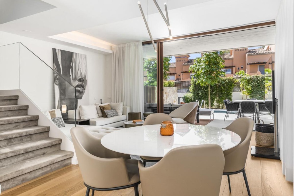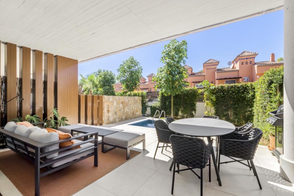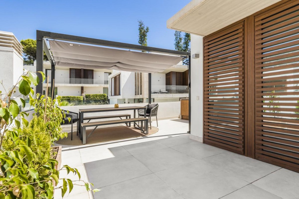 The exterior of the villa features a private plunge pool surrounded by a manicured garden and a terrace equipped with a large sofa, dining area, and state-of-the-art barbecue. This outdoor space provides the ideal setting for sunbathing, alfresco meals, or simply relaxing in the Spanish sun.