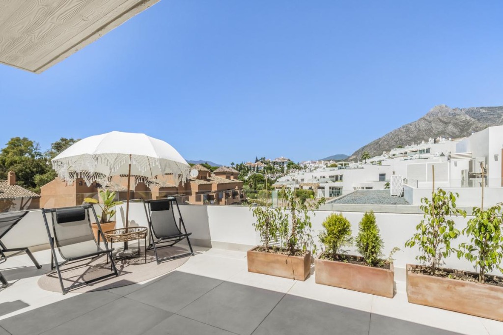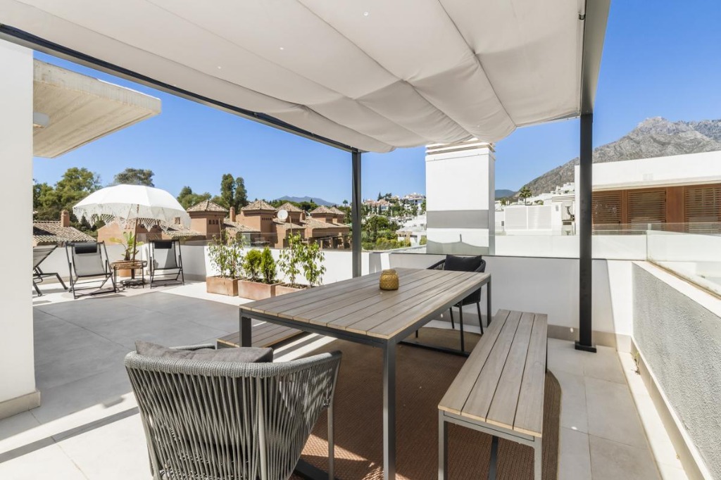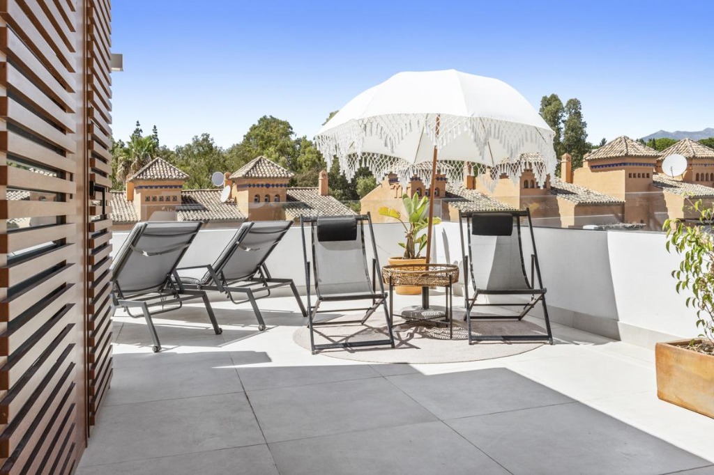 The rooftop terrace extends the living space outdoors, offering sun loungers, a parasol, a covered dining area, and a food preparation zone, ideal for relaxing or entertaining while taking in the surroundings.