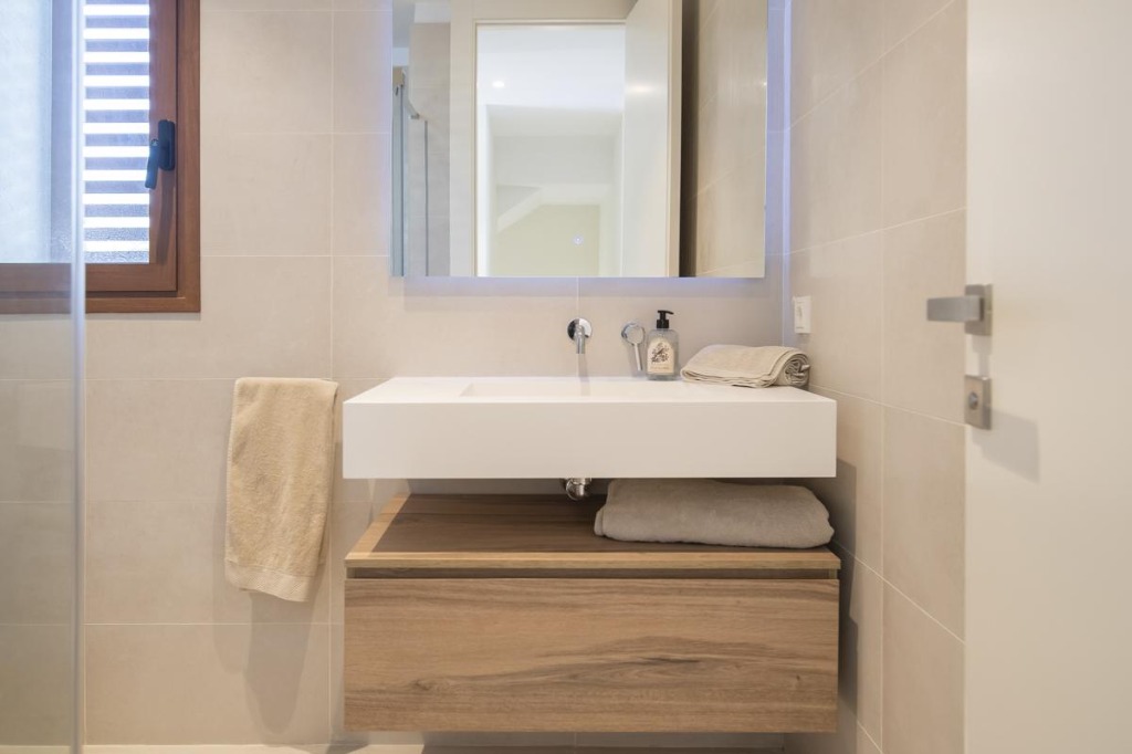 The first floor accommodates three bedrooms. The main bedroom boasts a large double bed, built-in wardrobe, en-suite bathroom, and private terrace for enjoying morning sun or evening views. The remaining two bedrooms feature double beds and share a modern shower and toilet, ensuring comfort for all guests.
