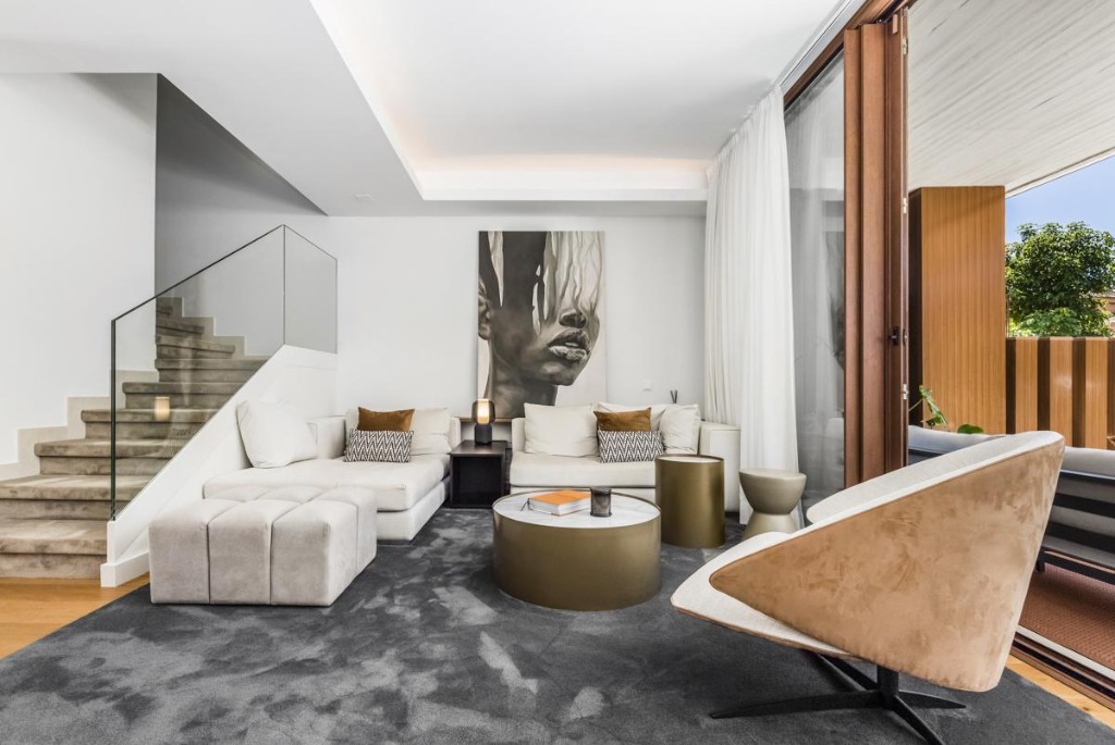 Inside, the open-plan living and dining area is designed with a sleek, minimalistic aesthetic, complemented by quirky scatter cushions that add a splash of color. A central dining table and fully-equipped modern kitchen with a central island unit make meal preparation and dining effortless, while the living area includes a Smart TV and comfortable seating for unwinding after a day exploring the Golden Mile.