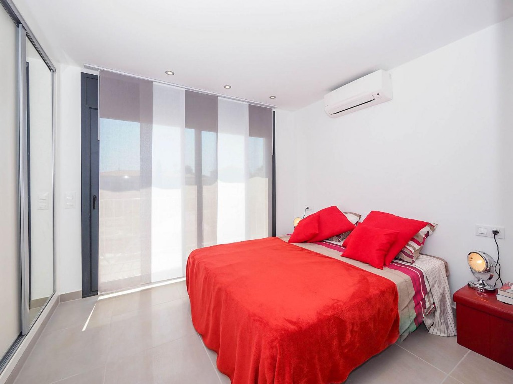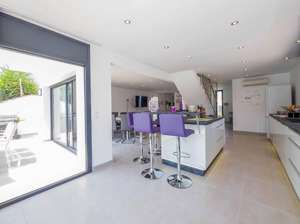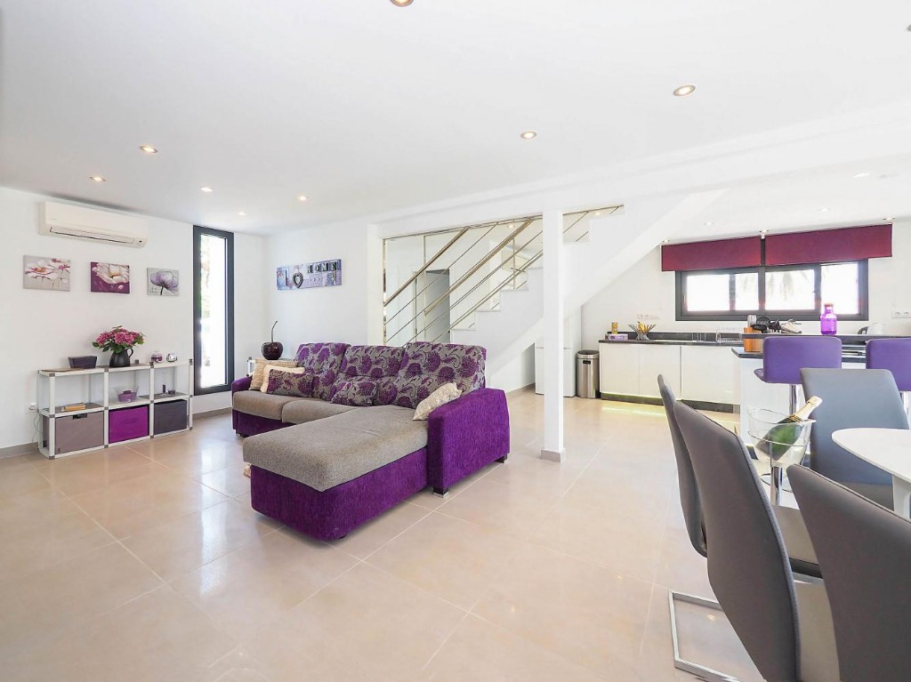 The interior is stylishly furnished with a large, open-plan living and dining area, equipped with a flatscreen TV offering international channels. The fully equipped kitchen features a breakfast bar and modern appliances, including a dishwasher, induction hob, microwave, and coffee machine. Upstairs, two double bedrooms with en-suite bathrooms open onto the upper terrace, enjoying views of the pool, canal, and garden. An additional double bedroom and a children's room with a bunk bed and single bed each have en-suite bathrooms. Air-conditioning, Wi-Fi, and private parking for four vehicles are provided.