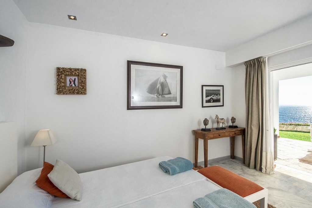Sleeping accommodations include seven bedrooms, each with en-suite bathrooms. Four bedrooms are located on the same level as the pool, while three additional bedrooms are on the upper floor. The master suite features a double bed and en-suite bathroom, offering extra privacy and direct access to a terrace with stunning sea views. Bedrooms can be arranged with either twin or double beds depending on the group's needs, ensuring flexibility and comfort for all guests.