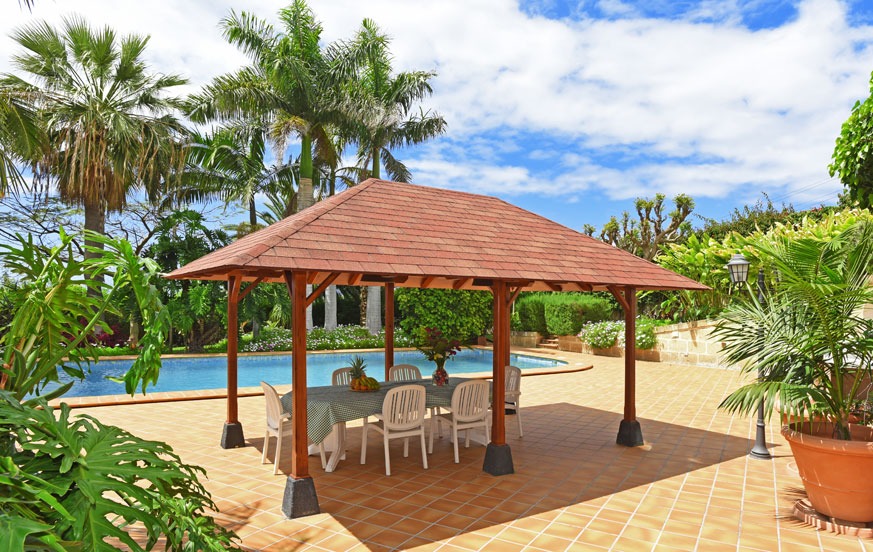 Outdoor amenities include multiple terraces, balconies, and courtyards, a 6 x 15 m private swimming pool (1.6 m deep), a wooden gazebo with seating, a table tennis table, and a trampoline. The tropical garden features 80 palm trees and exotic plants. Parking is available for up to 11 cars, including two dedicated spaces.