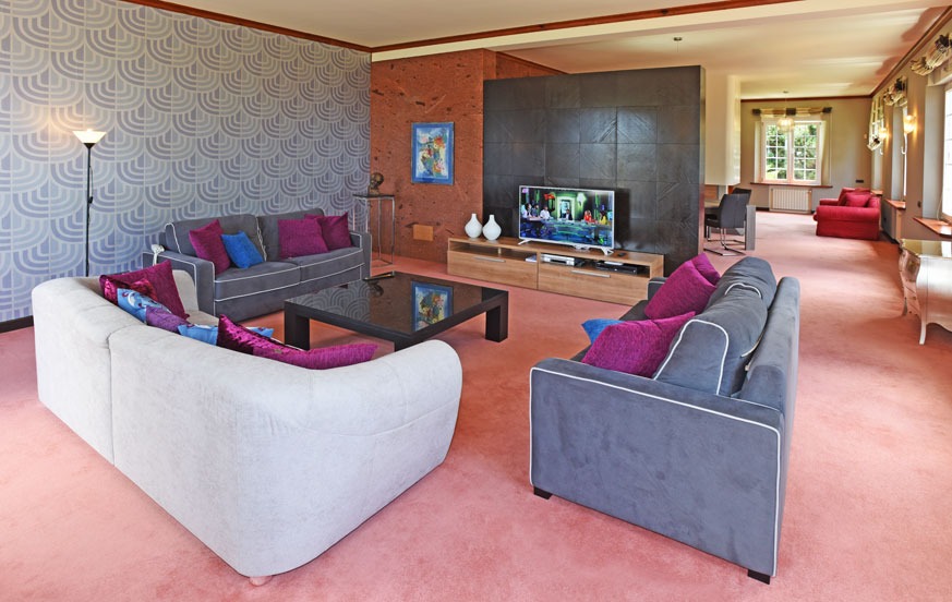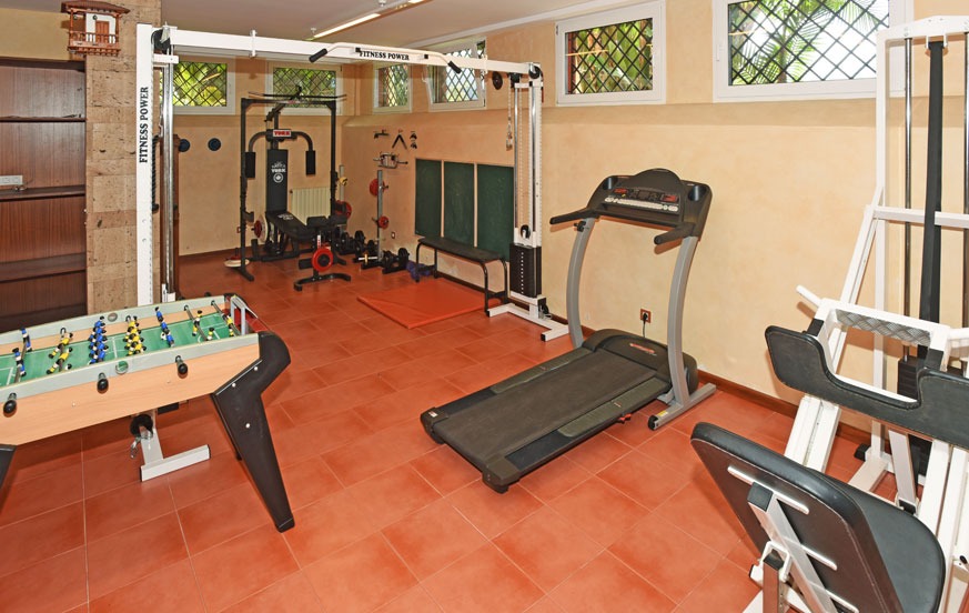 The basement features a 50 m² additional living room with kitchen, a professionally equipped gym, a pool table, and a guest toilet, offering entertainment and fitness options during your stay.