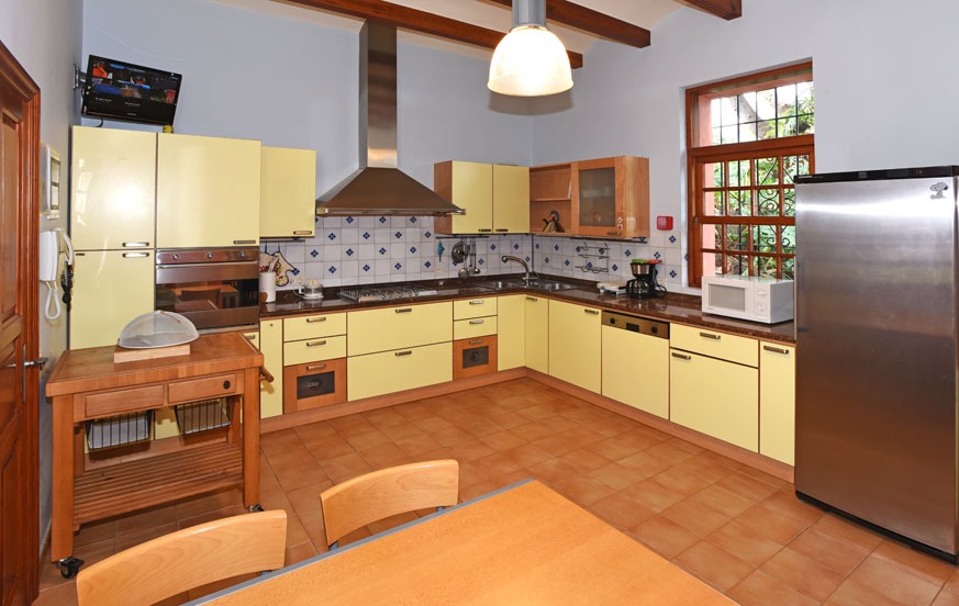 The villa provides towels, bed linen, a cot and highchair for families, central heating, a hairdryer, a safe, a cool bag, and four TVs with Spanish channels and satellite TV. Internet access (ADSL & WiFi) is included. The main kitchen is fully equipped with refrigerator, freezer, induction hob, oven, microwave, dishwasher, coffee maker, toaster, blender, and juicer, while the basement kitchen includes a fridge/freezer, ceramic hob, and microwave. The laundry room is equipped with a washing machine, iron, and ironing board.