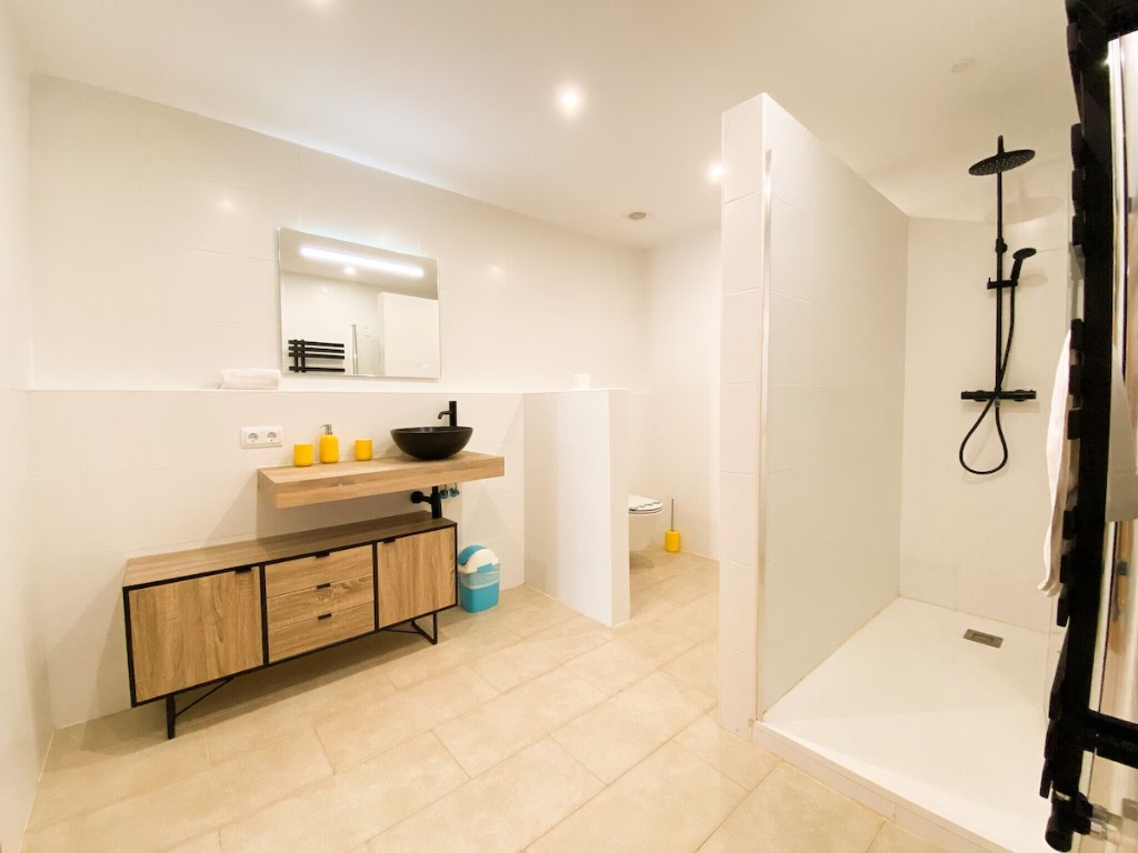 There are 3 bathrooms, each with a shower, plus an additional separate toilet. Practical holiday comforts are also included, such as heating, a washing machine, dryer, vacuum cleaner, iron and ironing board, hair dryer, and a clothesline with clothespins.