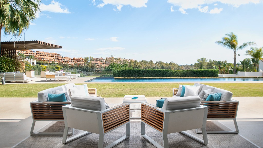Outdoor features: The semi-covered porch runs the full length of the house, furnished with comfortable chairs, sofas, and an 8-seater table for alfresco dining. The landscaped garden overlooks the Atalaya Golf course and features a large infinity swimming pool with a shaded chill-out area. Multiple terraces provide space for sunbathing, relaxing, or entertaining guests in comfort and style.