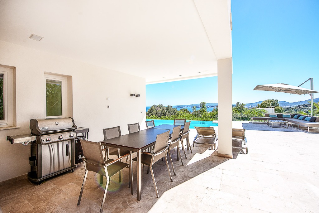 The villa features a spacious terrace with panoramic sea views, surrounded by lush landscaping and a glass railing for privacy. Guests can lounge by the infinity pool, relax on shaded seating areas, or prepare meals in the covered al-fresco kitchen and dining space with barbecue facilities. Inside, the open-plan living, dining, and fully equipped kitchen area is flooded with natural light, styled with neutral tones, clean lines, and vibrant artwork, and opens onto a full-width balcony overlooking the hills.