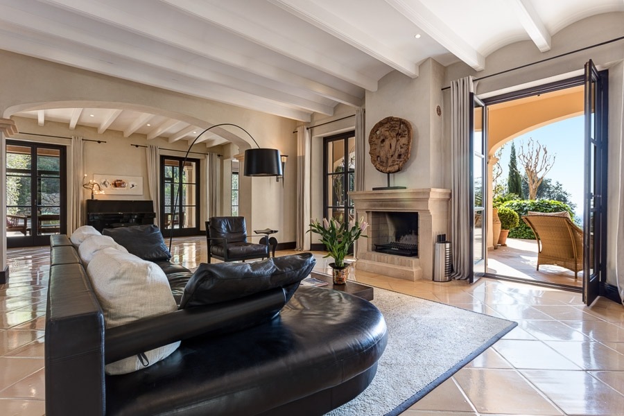 The rear garden is meticulously landscaped, surrounding a large pool with Jacuzzi. A porch with a fireplace enhances the outdoor space, providing the perfect setting for relaxation and entertaining. Two annexes house guest apartments on either side of the main residence. Additional luxury features include marble countertops, a media room/home theater, a wine cellar/grotto, multiple terraces capturing stunning mountain and water views, a spa/hot tub, and a steam room.