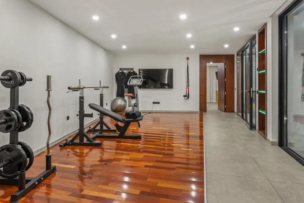 Lower Ground Floor: - Bedroom with two single beds, en-suite shower, and access to a private patio - Indoor gym with elliptical bike, weights, and other equipment - Hammam - Laundry room - Indoor garage