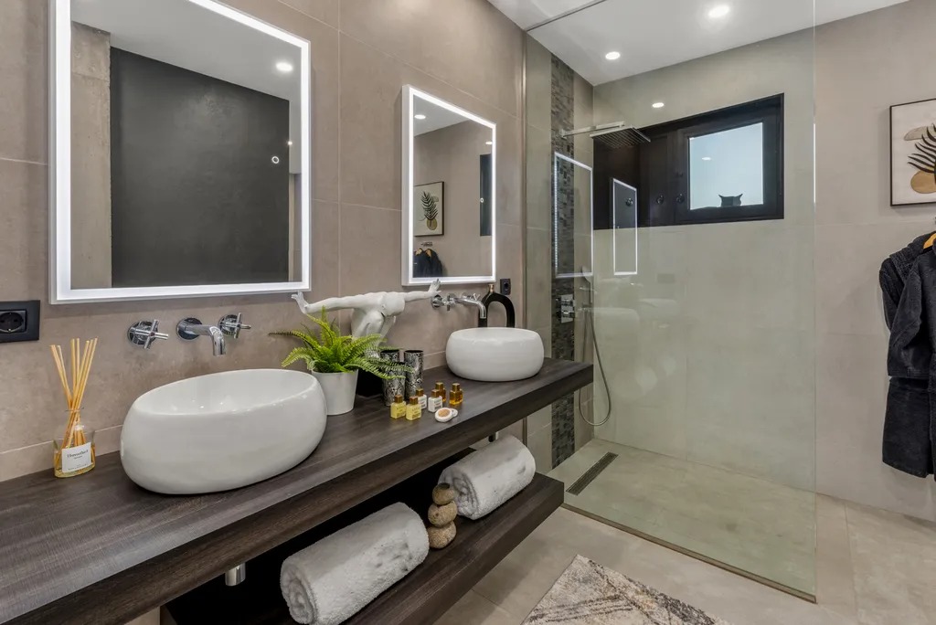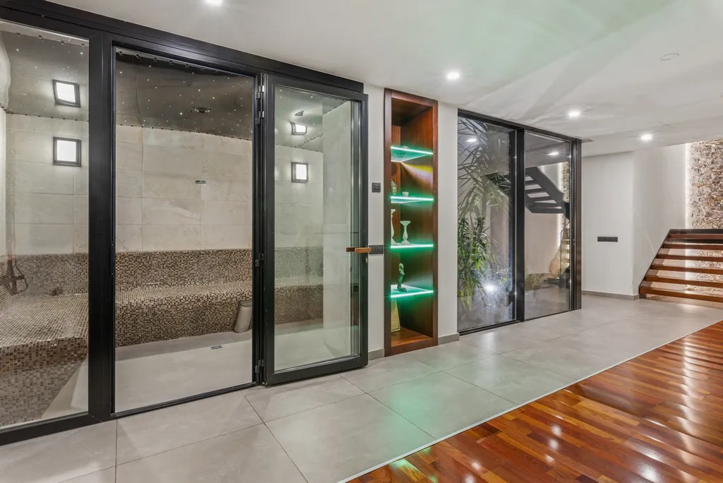On the ground floor, the spacious living room is bright and inviting, featuring a statement fireplace and large Smart TV for relaxed movie nights. The fully equipped kitchen provides a perfect space for cooking, and a separate TV room adds flexibility for entertainment. Upstairs, three of the bedrooms offer double beds, en-suite bathrooms, and private terraces. The main bedroom also includes a walk-in wardrobe, providing a luxurious personal space. On the lower ground floor, a fourth bedroom with two single beds is ideal for teenagers seeking privacy. This level also includes the indoor gym with high-tech equipment, a hammam, and a laundry room, combining wellness and convenience.