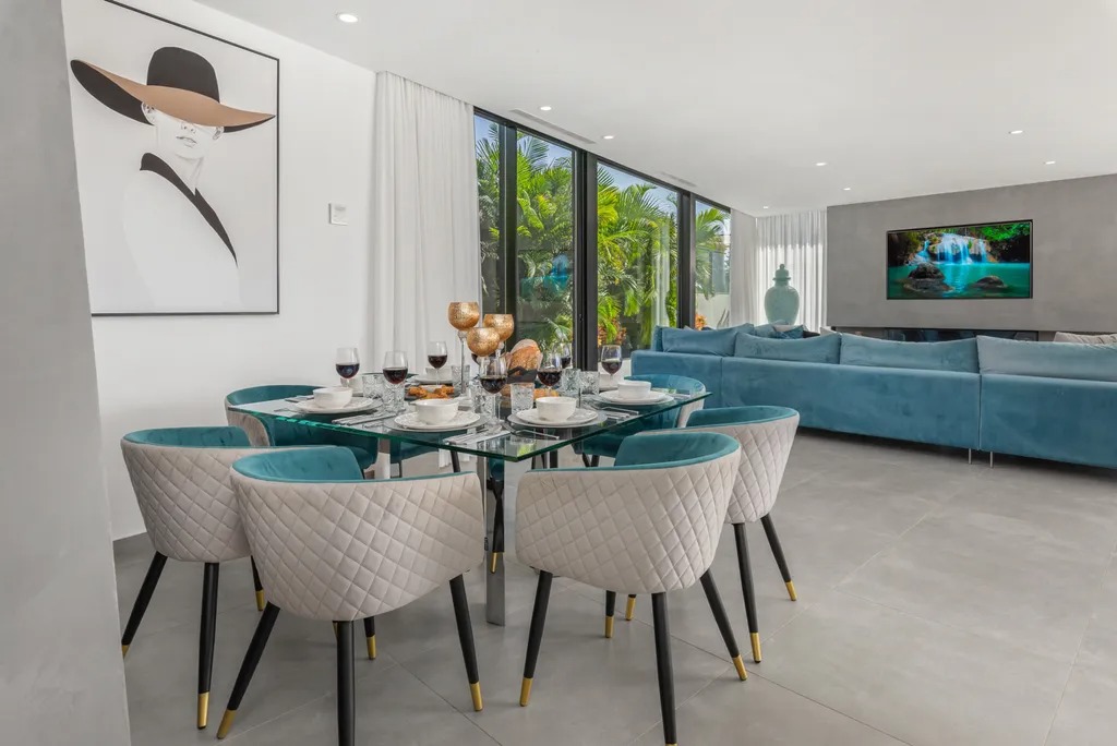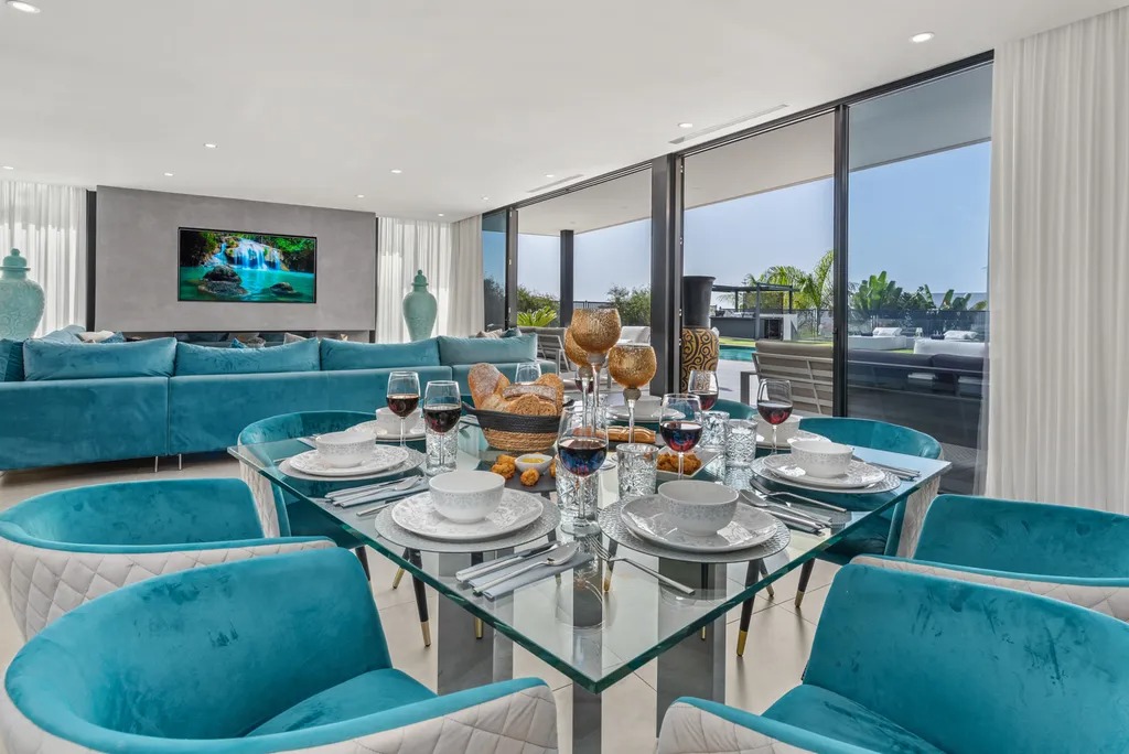 Ground Floor: - Open-plan living room with wall-mounted TV, fireplace, and 8-seater dining table, with terrace access - Fully-equipped modern kitchen with central island - TV room with sofa, wall-mounted TV, and exterior access - Guest toilet