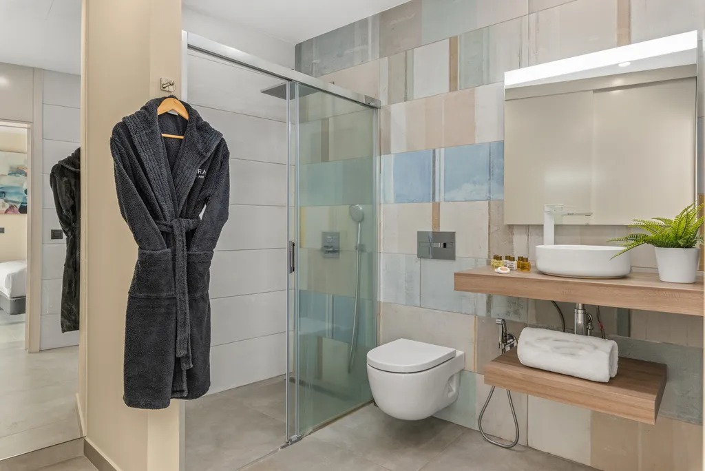 First Floor: - Main bedroom with double bed, en-suite bathroom, walk-in wardrobe, and private terrace - Bedroom with double bed, en-suite shower, and private terrace - Bedroom with double bed, en-suite shower, and private terrace