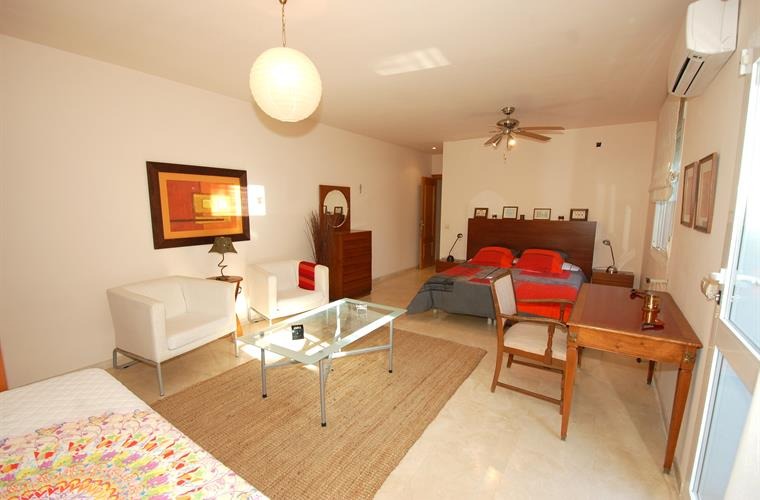 This villa is located just steps from the beach, offering wonderful views of the bay, sunrises, and sunsets. The main level features a spacious living room with a modern TV and log fireplace, a fully equipped kitchen with breakfast bar and pantry, a dining area on the west terrace with stunning views to the bay and Gibraltar, guest toilet, parking area, and entrance porch.