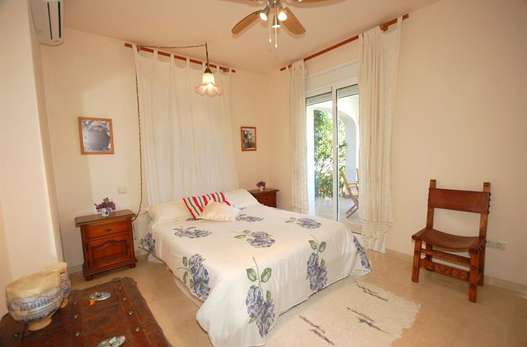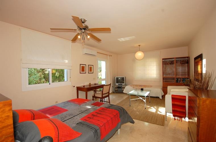 - Second bedroom: large en-suite with double bed plus single, TV, two armchairs, and patio garden with private entrance. - Third bedroom: semi-suite with twin beds, patio doors to porch, garden, and pool; shares Jack & Jill bathroom with fourth bedroom. - Fourth bedroom: double bed with patio doors to porch, garden, and pool.