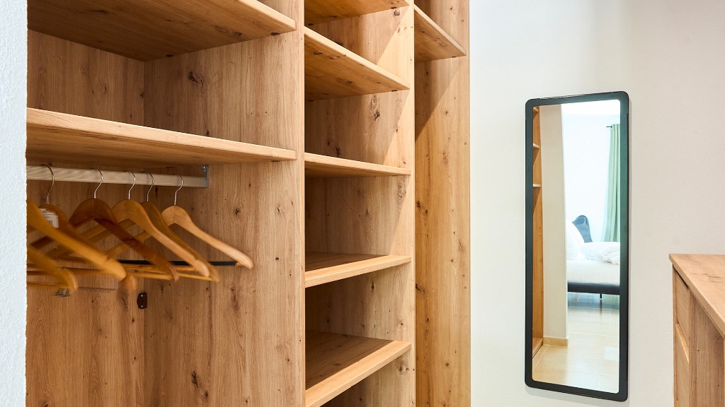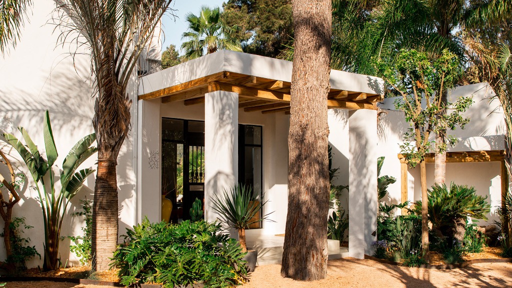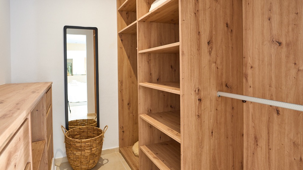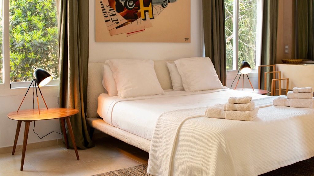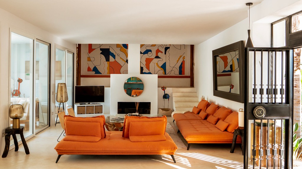 The interiors embody Ibizan chic. A spacious lounge with twin sofas extends to a mezzanine filled with natural light through large picture windows. The kitchen, hidden behind a generous bar area, is fully equipped and ideal for gathering and preparing meals with friends or family. Each room is thoughtfully designed with modern touches, ensuring both comfort and sophistication.