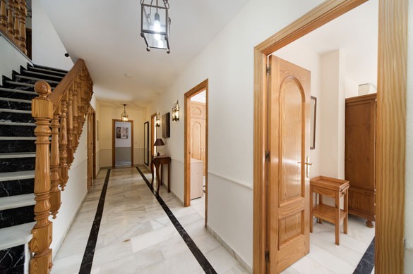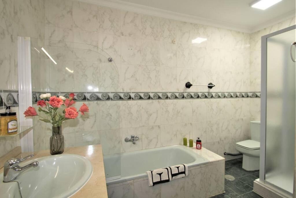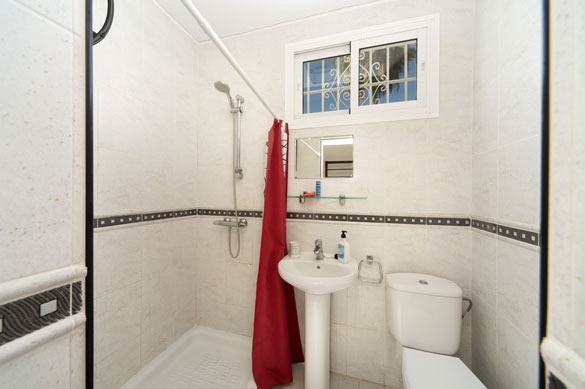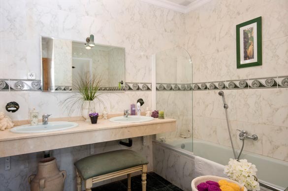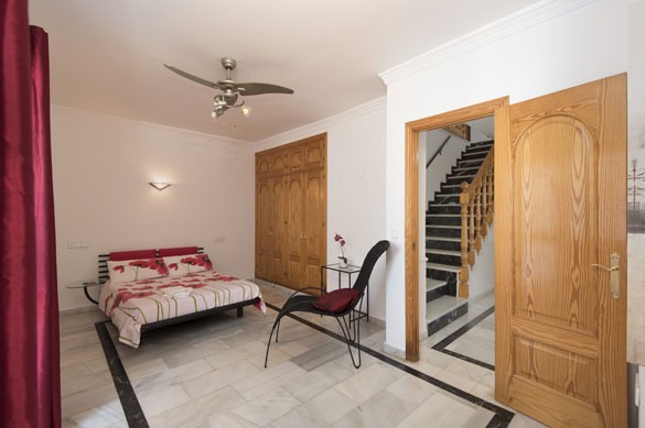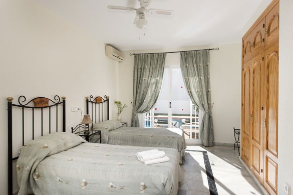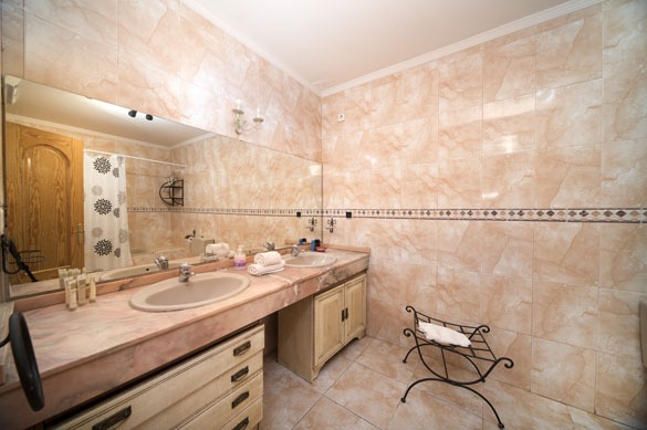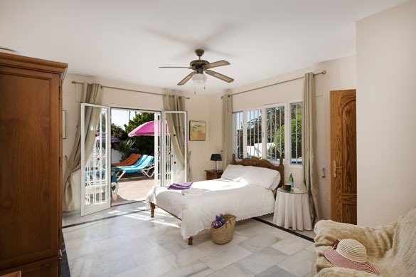 The lower floor hosts the bedrooms, all with patio doors opening to the garden or pool, fitted wardrobes, and air conditioning/heating. The master double bedroom features a spacious pink marble en suite bathroom with twin basins. Two comfortable double bedrooms connect to an en suite shower room, while the two twin bedrooms share a family-sized bathroom with shower cubicle and twin basins.
