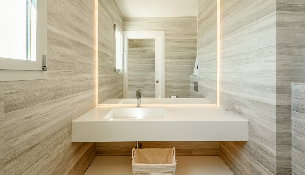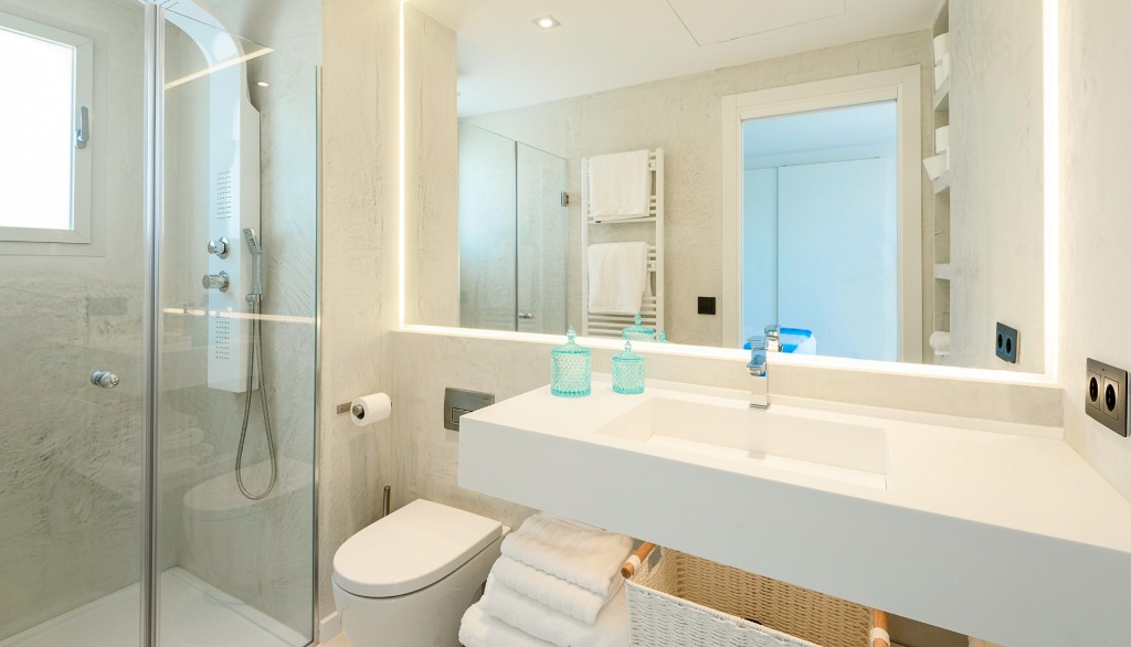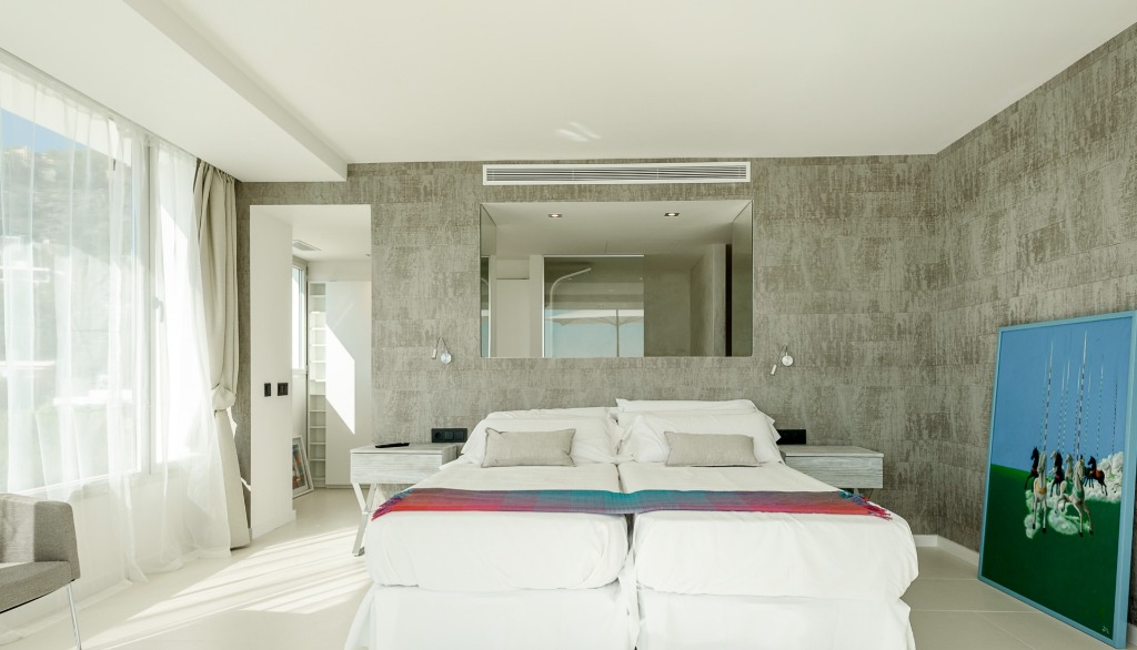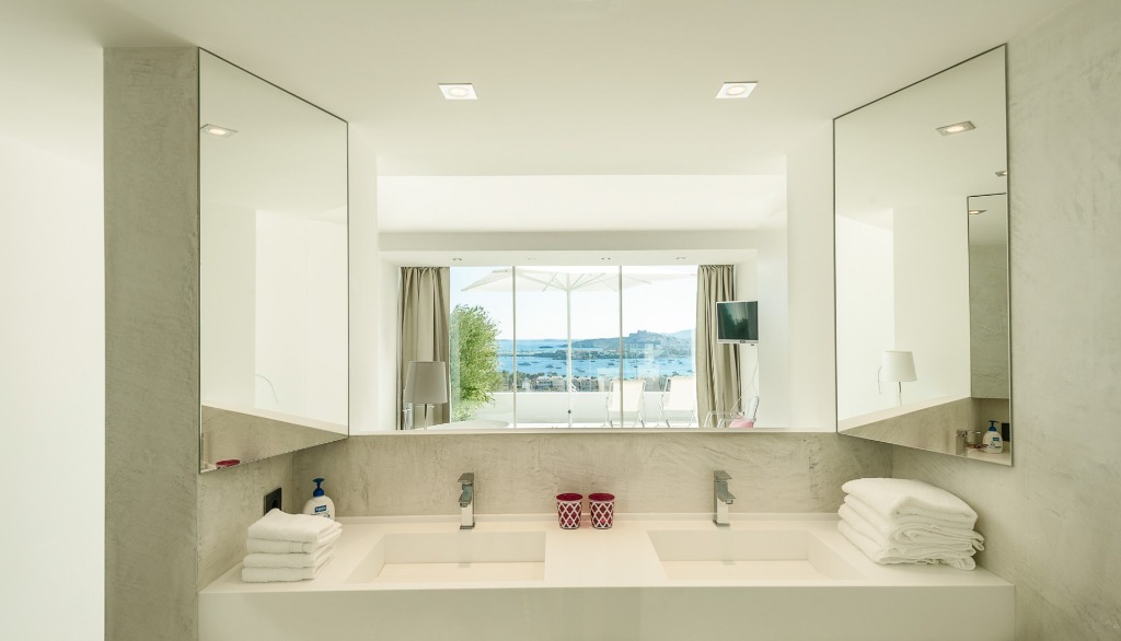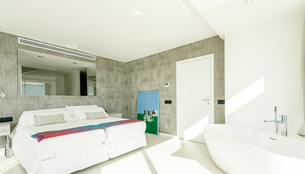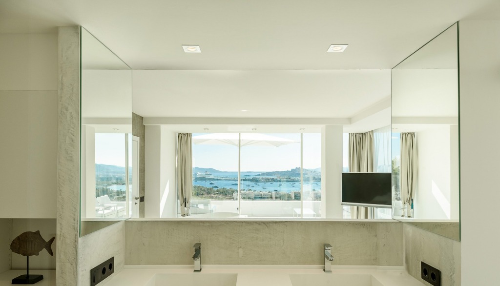 This holiday home offers four high-quality bedrooms on the first two floors for up to 8 people, all with en-suite bathrooms, smart TVs, LED color lighting and dressing areas. The two master suites also have freestanding bathtubs, open bathrooms and access to a private sunset terrace. The third floor, in addition to the quiet office working area, has its own Sky Bar and 360° rooftop terrace, which rewards its visitors with stunning day and night views of the glittering ocean, the old town of Ibiza and the mountains of Cap Martinet.