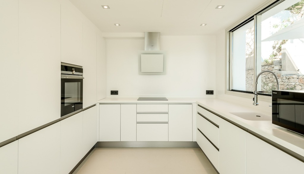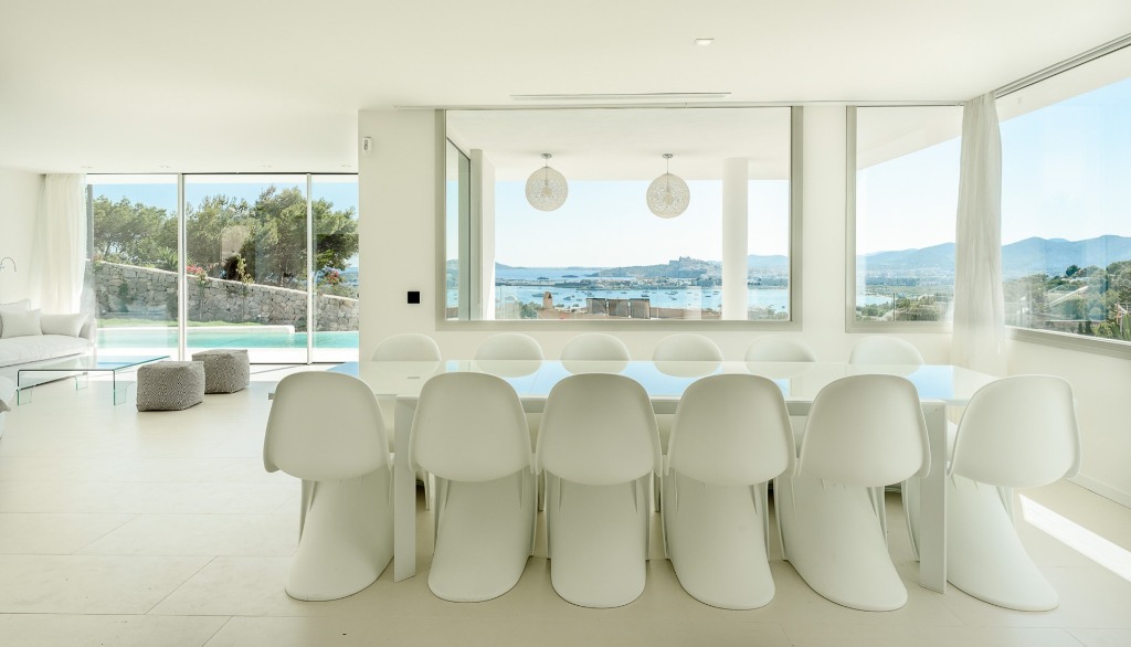 Blessed with a prime location, the villa has already provided a unique home and hospitality to some well-known international celebrities, who have been satisfied in every way. As soon as you enter, the white, three-storey villa with its open and light-flooded rooms looks particularly elegant. Nothing superfluous distracts attention from the skillfully staged view of the bay and lets the eye wander all the way to Ibiza's old town Dalt Vila. The sea panorama is fully integrated into the open living and dining area. If you open the large windows, the infinity pool looks like a natural extension of the living area. Exterior becomes interior and vice versa. With numerous sun loungers, terraces and chill-out areas, the outdoor area invites you to take a refreshing dip in the pool and relax.