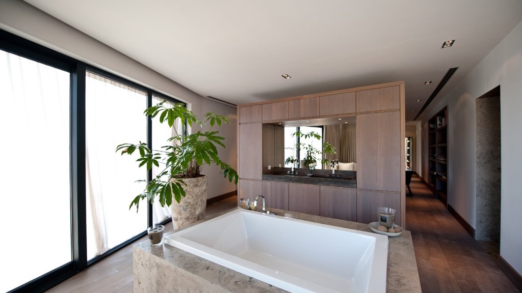 First Floor: - Master bedroom: double bed, en-suite bathroom with bathtub and shower, private balcony with seating and panoramic sea views, separate office space, TV, and sound system