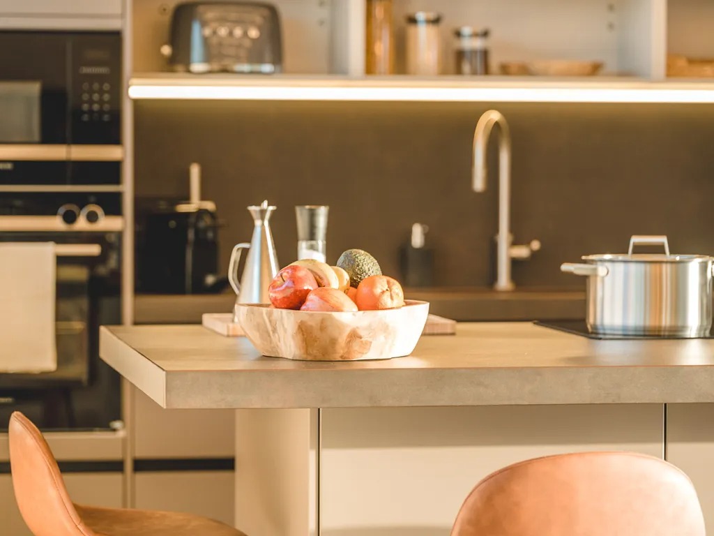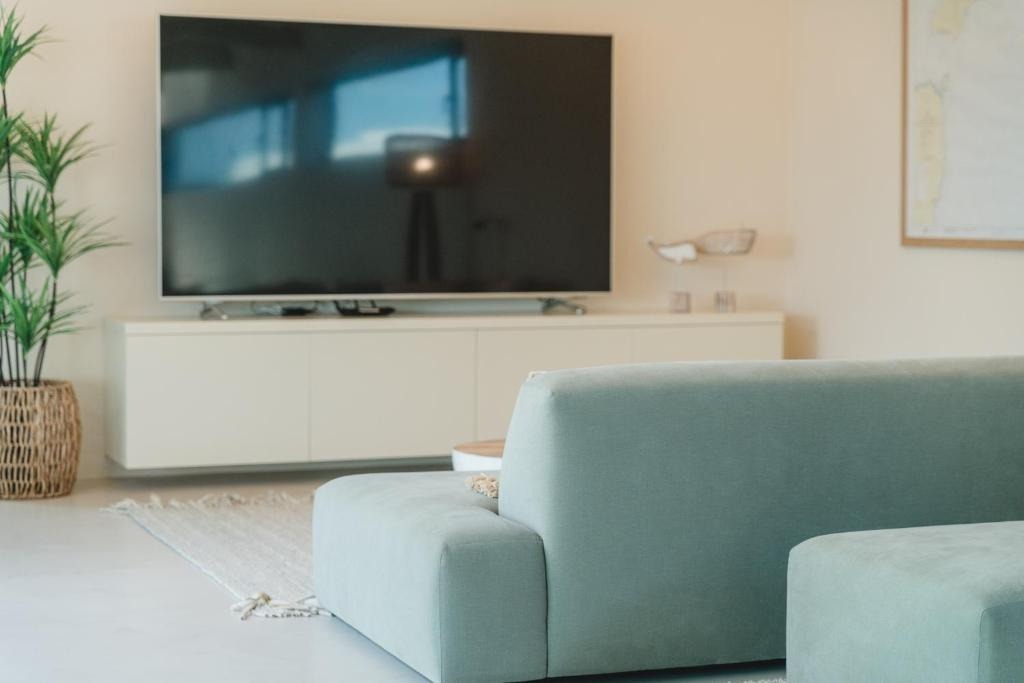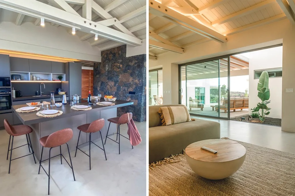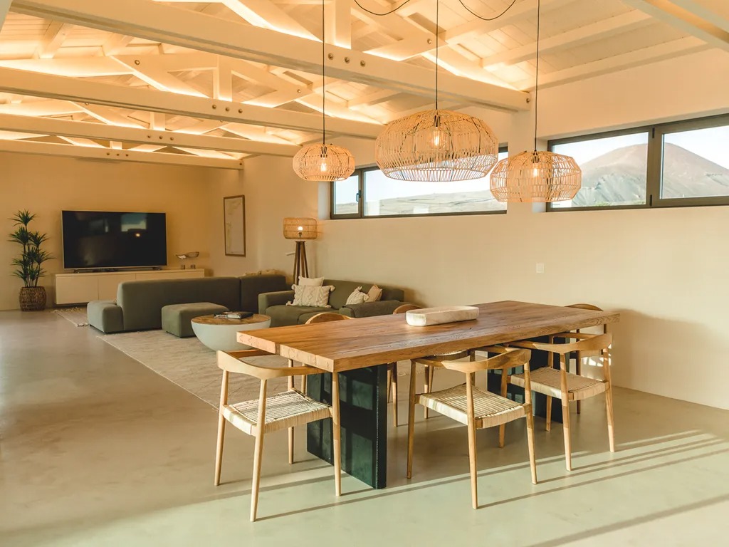 Inside, an open-plan living, dining, and kitchen area offers views of the Calderón Hondo Volcano. A TV lounge with an eighty-six-inch Smart TV creates a comfortable spot to unwind. The kitchen includes a breakfast bar with stools, perfect for casual meals and conversation while cooking.