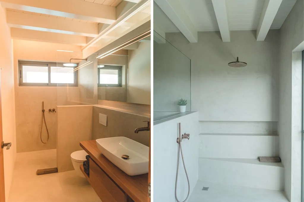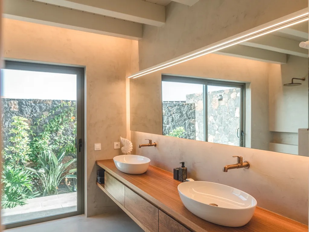 The exterior is equally inviting, with a heated private swimming pool surrounded by a volcanic garden and sun loungers. Guests seeking active fun can enjoy a skatepark with a halfpipe designed by Sergi Arenas, nestled among the palm trees. A covered dining area with a grill provides space for alfresco meals, and an additional outdoor Balinese-style shower complements the poolside experience.