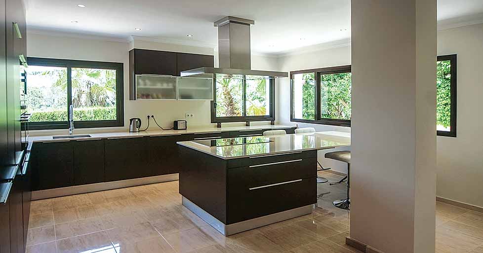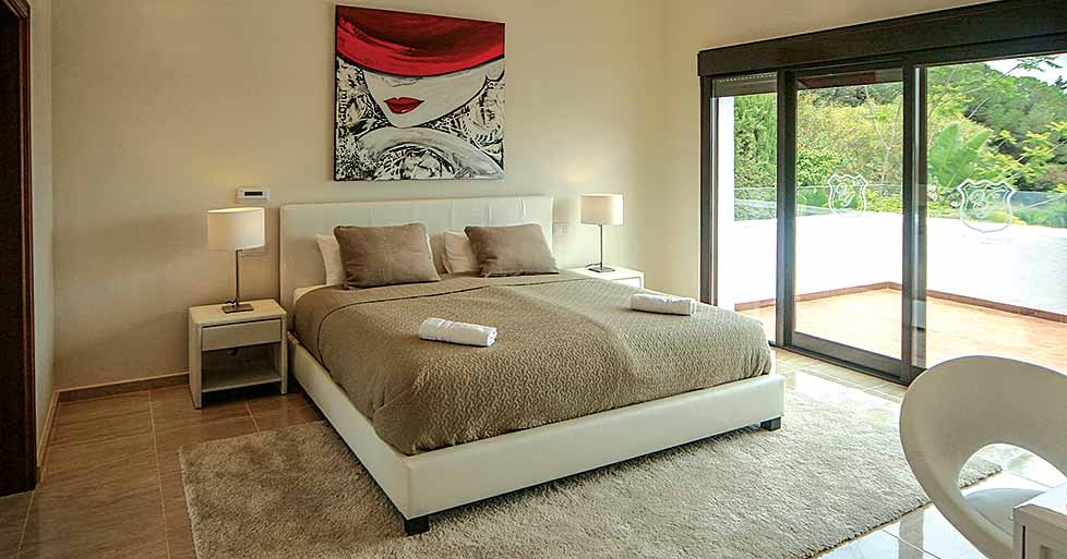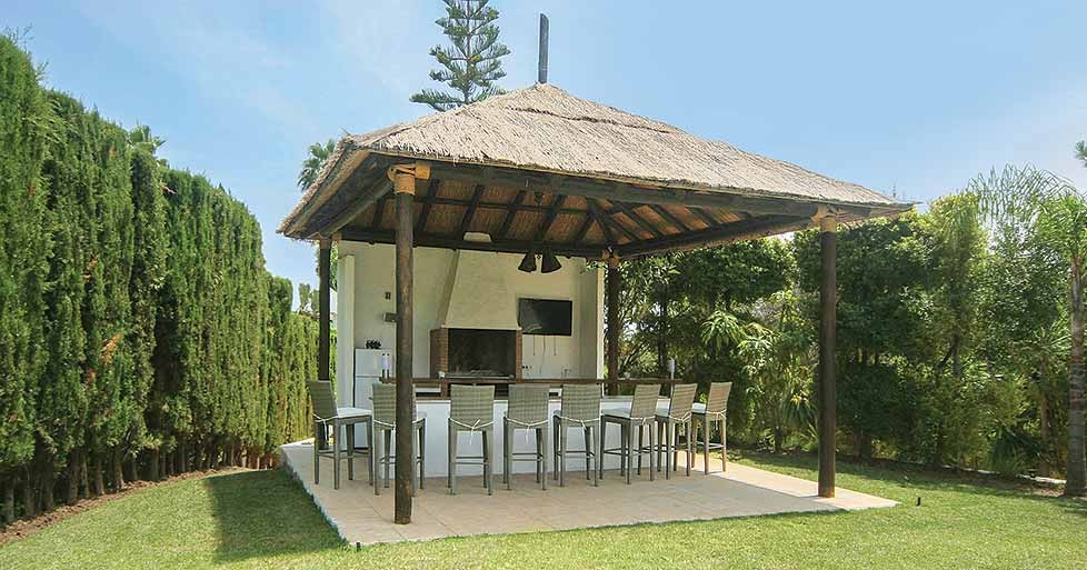 The live-in housekeeper/cook can serve drinks, prepare breakfast, and provide up to two main meals daily, making this villa perfect for large groups or family holidays. At the far end of the garden, a charming thatched chiringuito with a barbecue, sink, and bar stools invites guests to take turns cooking or enjoying relaxed poolside gatherings.