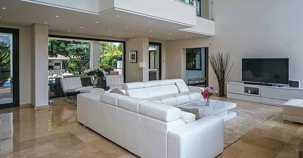 Inside, the villa showcases sophisticated contemporary décor and furnishings within a spacious, open-plan layout. Polished marble floors and predominantly white paintwork reflect the abundant natural light streaming through expansive picture windows and sliding patio doors, while select canvases add touches of artistic flair throughout the home.