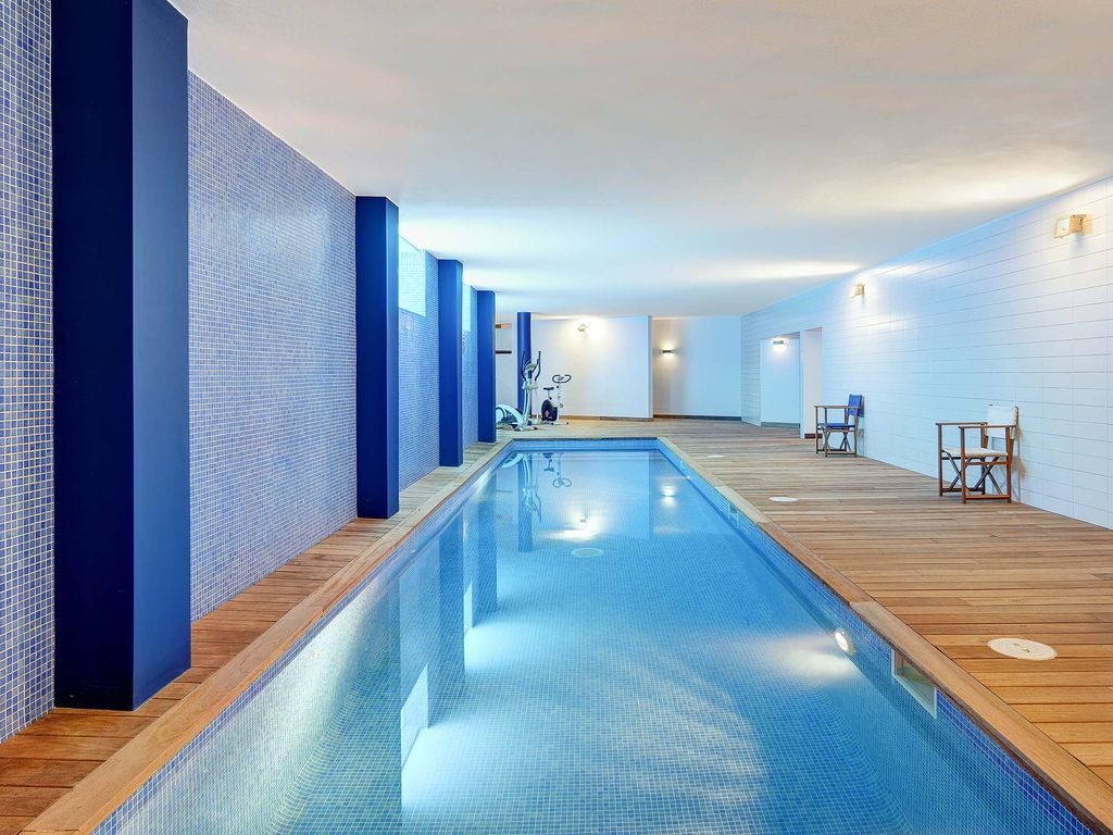 The villa spans three levels. The lower ground floor houses the mosaic-tiled heated pool and a fitness area with gym equipment. The entry level includes a modern living space with a stylish dining area, pool table, and comfortable sofas, complemented by a fully equipped country kitchen. Three of the four bedrooms-one double and two twins-are also located here.