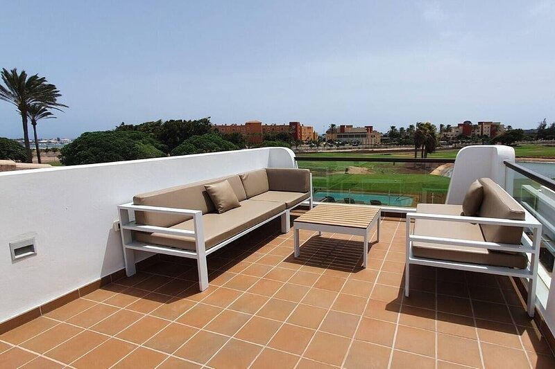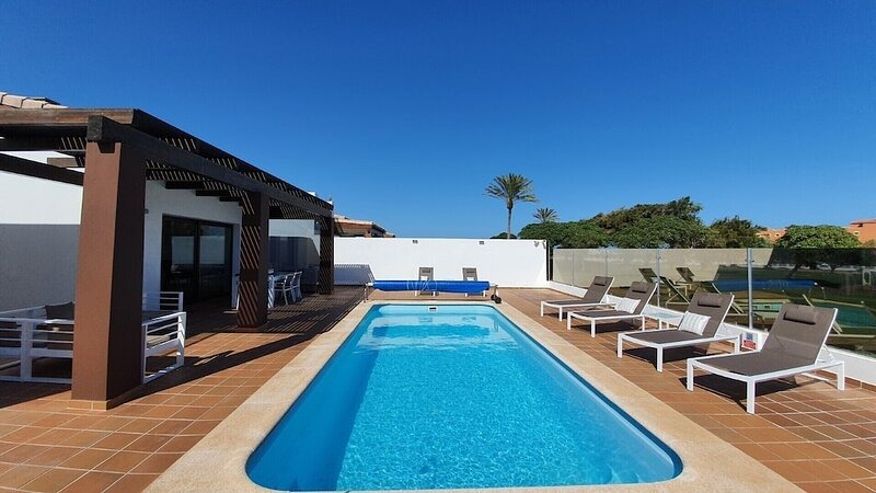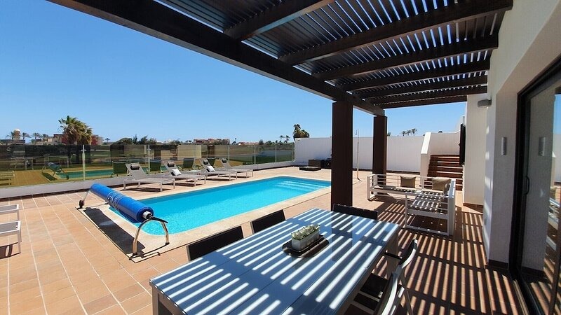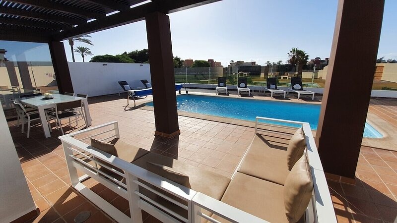 With a private heated pool, golf course vistas, and luxurious amenities, this property provides the perfect balance of tranquility and adventure for an unforgettable holiday in Caleta de Fuste, Fuerteventura.