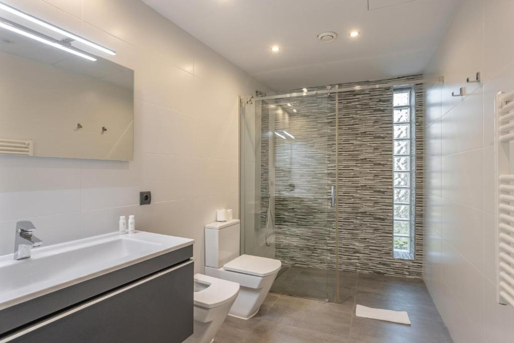 The villa features minimalist architectural finishes and expansive windows that fill the interiors with natural light. The ground floor includes a spacious living area with an open-plan kitchen equipped with modern appliances, a guest toilet, and a double bedroom with an en-suite bathroom. Upstairs, three additional double bedrooms each include en-suite bathrooms, providing comfort and privacy for all guests.