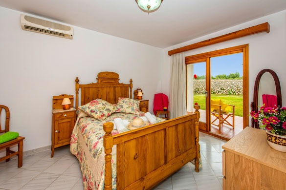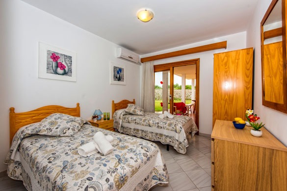 The villa includes two twin bedrooms and a double bedroom sharing a separate bathroom and shower room, while a second double bedroom has an en suite bathroom. Patio doors in the right-side bedrooms open onto the garden, enhancing the indoor-outdoor flow.