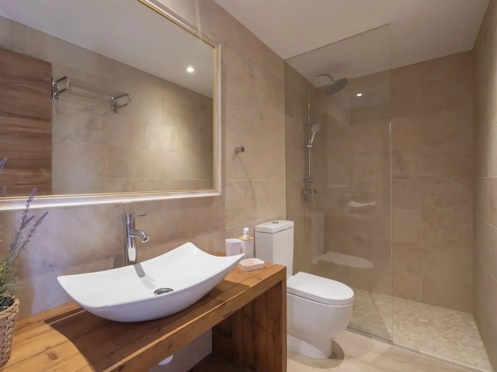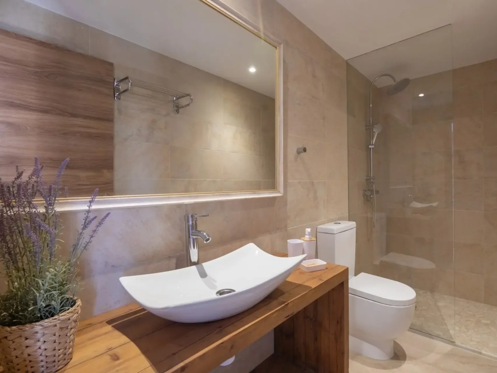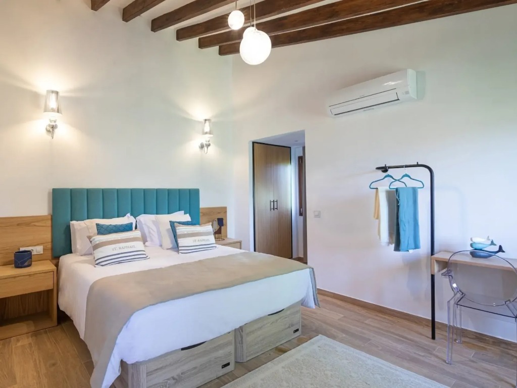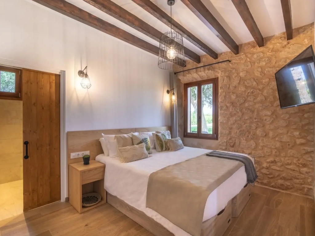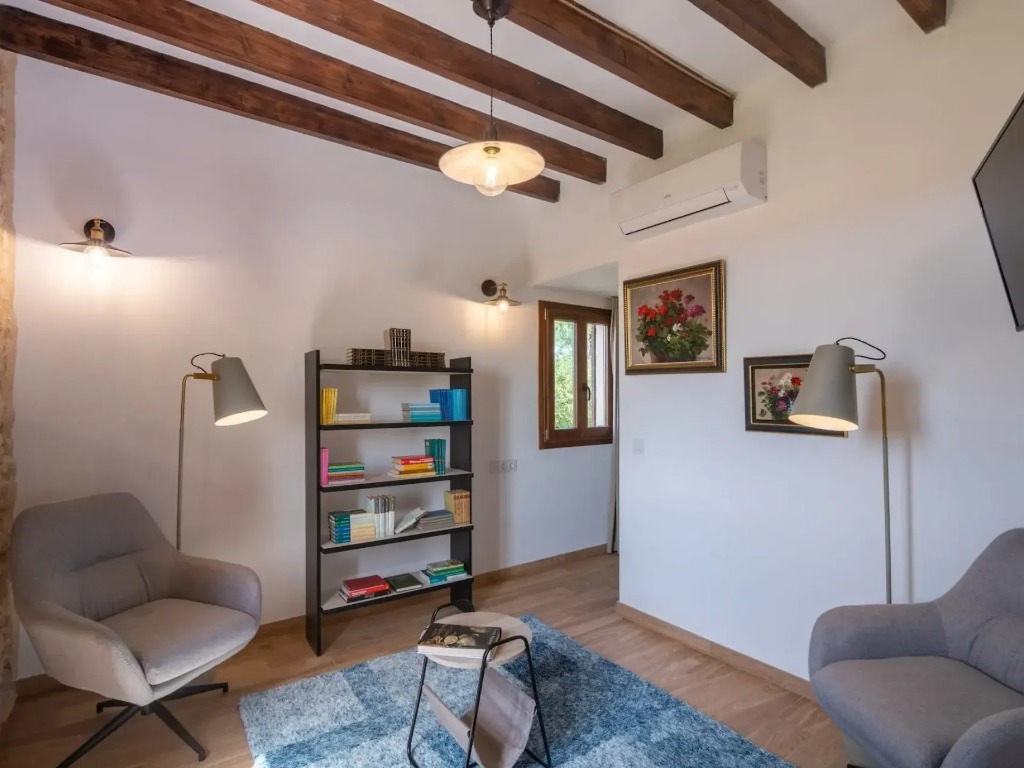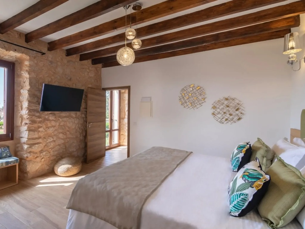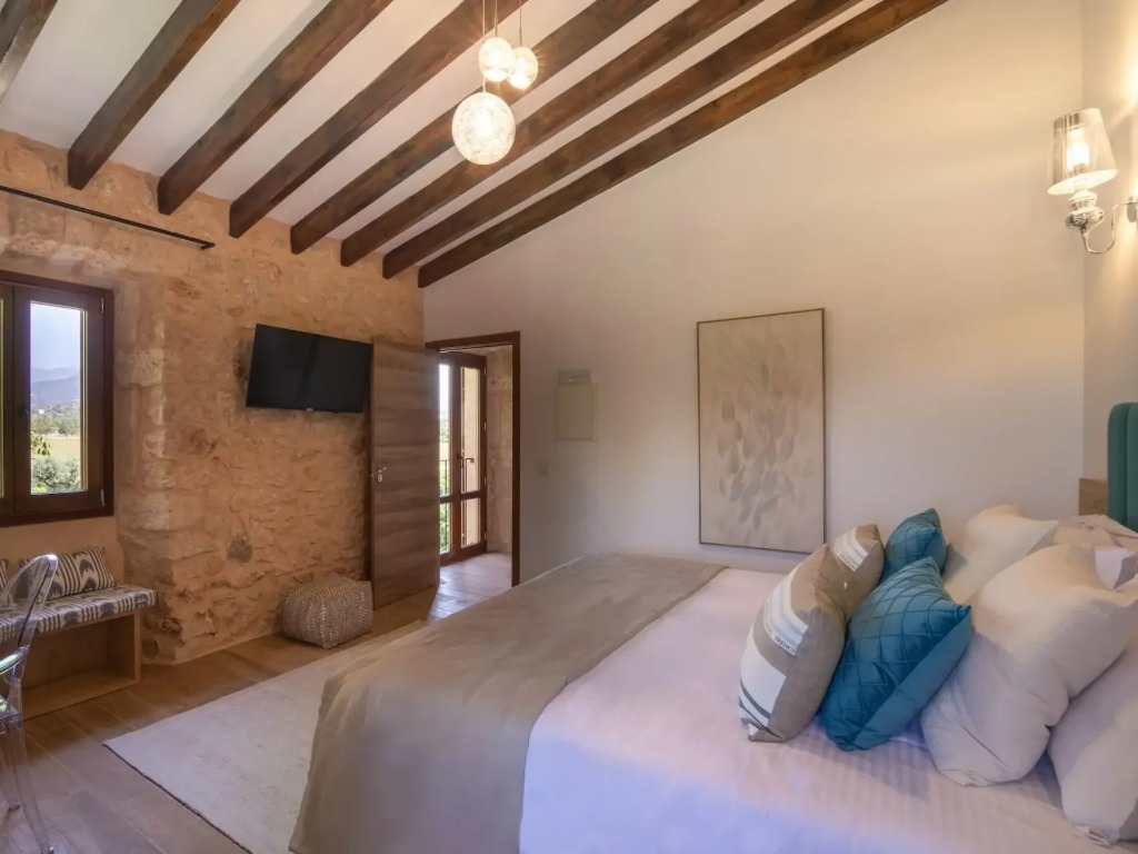 The interior preserves much of the original structure while incorporating high-quality contemporary finishes throughout. Each of the eight bedrooms is uniquely decorated, offering its own character and style. All bedrooms feature en-suite bathrooms, air conditioning, TV, wardrobes and beautiful views of the Tramuntana mountains, the gardens or the nearby village. One double bedroom is conveniently located on the ground floor and adapted for guests with reduced mobility, while the remaining rooms occupy the upper floors. In addition, there is a multipurpose room configured as a reading and gaming lounge with its own bathroom, offering extra comfort and flexible use for families and groups.