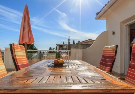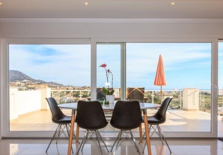 The ground floor comprises a bright living room with comfortable leather sofas, a dining table for 8, and an open, fully equipped kitchen with dishwasher, oven, and microwave. The upper terrace is furnished with a dining area and offers stunning views of Mijas Mountain, Fuengirola, and the Mediterranean.