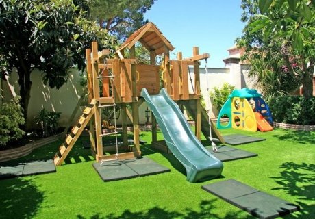 Outside, the villa offers a heated pool (8x4 m) with a telescopic cover for year-round use, sunbeds, a large chill-out bed, an outdoor porch with tables and chairs, a barbecue area for up to 10 guests, landscaped gardens, a pond with waterfall, and a children's playground with slide and swings. The property is gated, ensuring privacy and safety.