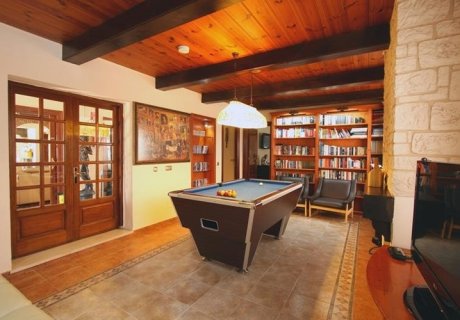 The villa's interiors include two spacious lounges: one with leather sofas, a 42" flat-screen TV, satellite film system with over 500 films, DVD, and Netflix; the second lounge/library also has a 42" TV, film system, books, table games, pool table, and sofas. Both lounges are fully air-conditioned.