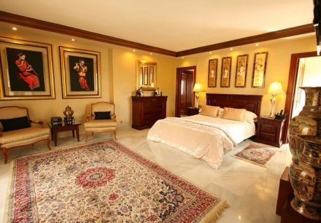 This villa in San Pedro Alcantara offers 5 bedrooms, all with en-suite bathrooms, accommodating up to 14 guests. Each bedroom is uniquely themed, representing countries such as Egypt, India, Indonesia, China, and Africa, with high-quality mattresses, top linen, air conditioning, music centers, safes, and LCD TVs with Spanish TDT, satellite, and film systems.