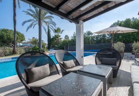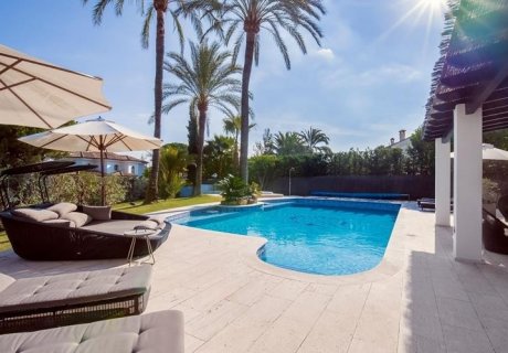 This luxurious 5-bedroom holiday villa in Nueva Andalucia accommodates 12 guests, with a heated pool, spacious garden, and close to Puerto Banus for rentals.