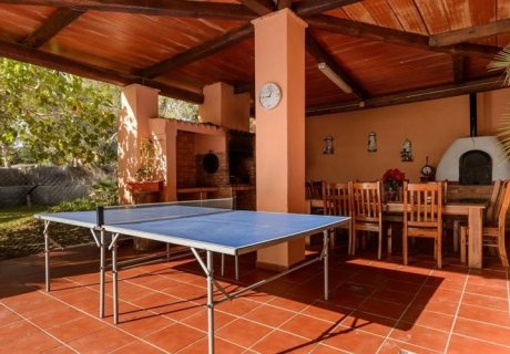 The outdoor area is perfect for family fun, featuring a large fenced garden, children's play equipment, and a ping pong table. This villa is conveniently located just 5 km from Ibiza city and 6.5 km from Playa d'en Bossa, offering easy access to the island's vibrant culture and stunning beaches.