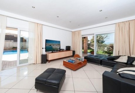 This contemporary villa accommodates up to 10 guests with five comfortable bedrooms, each with two twin beds, air conditioning, heating, and ample closet space. Two bedrooms include en-suite bathrooms, with two additional bathrooms and a separate toilet available. The bright and airy living room features comfy sofas, satellite TV, Wi-Fi, and a large dining area, perfect for socializing and enjoying meals together. The fully equipped modern kitchen includes all the appliances needed for preparing meals with family and friends.